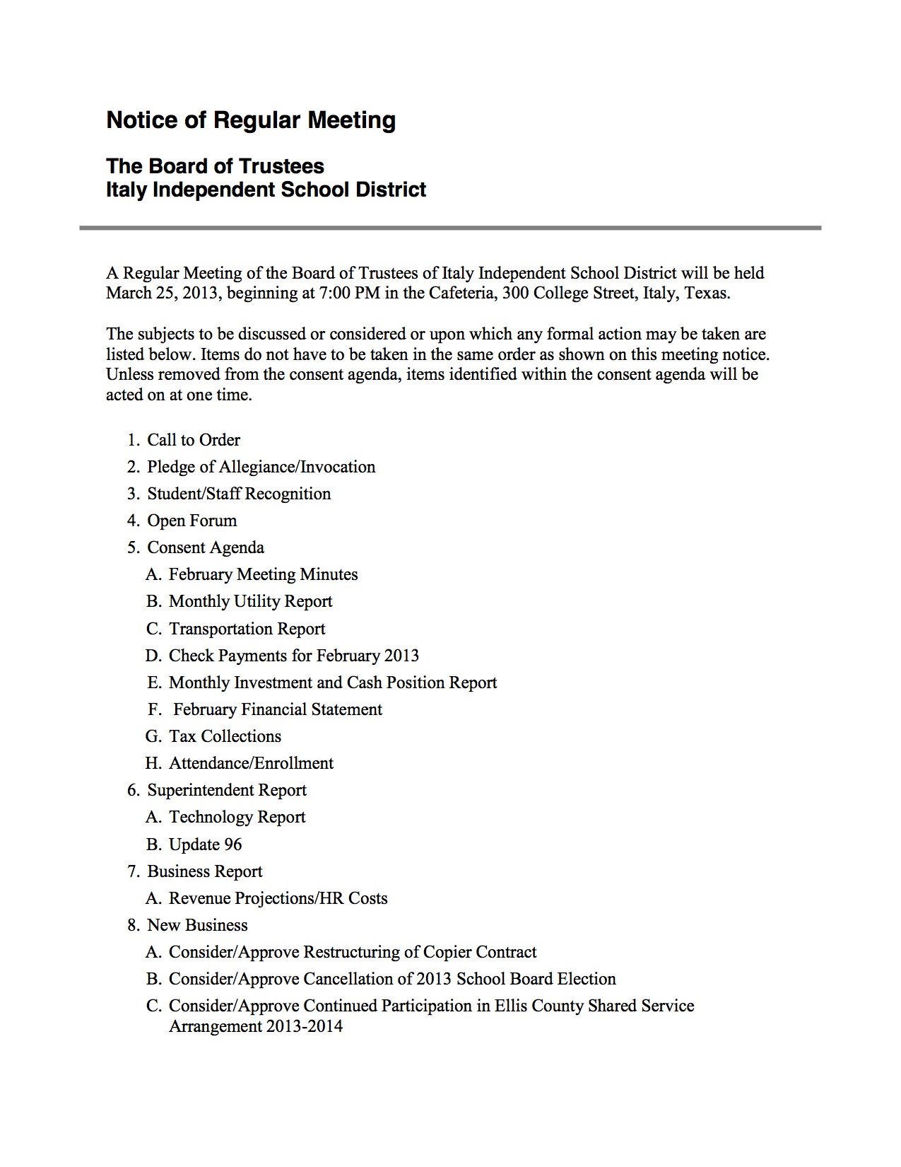 Agenda: Italy ISD School Board Meeting – Monday, March 25, 2013 « previous story album next » Agenda – page 1 Download original photo