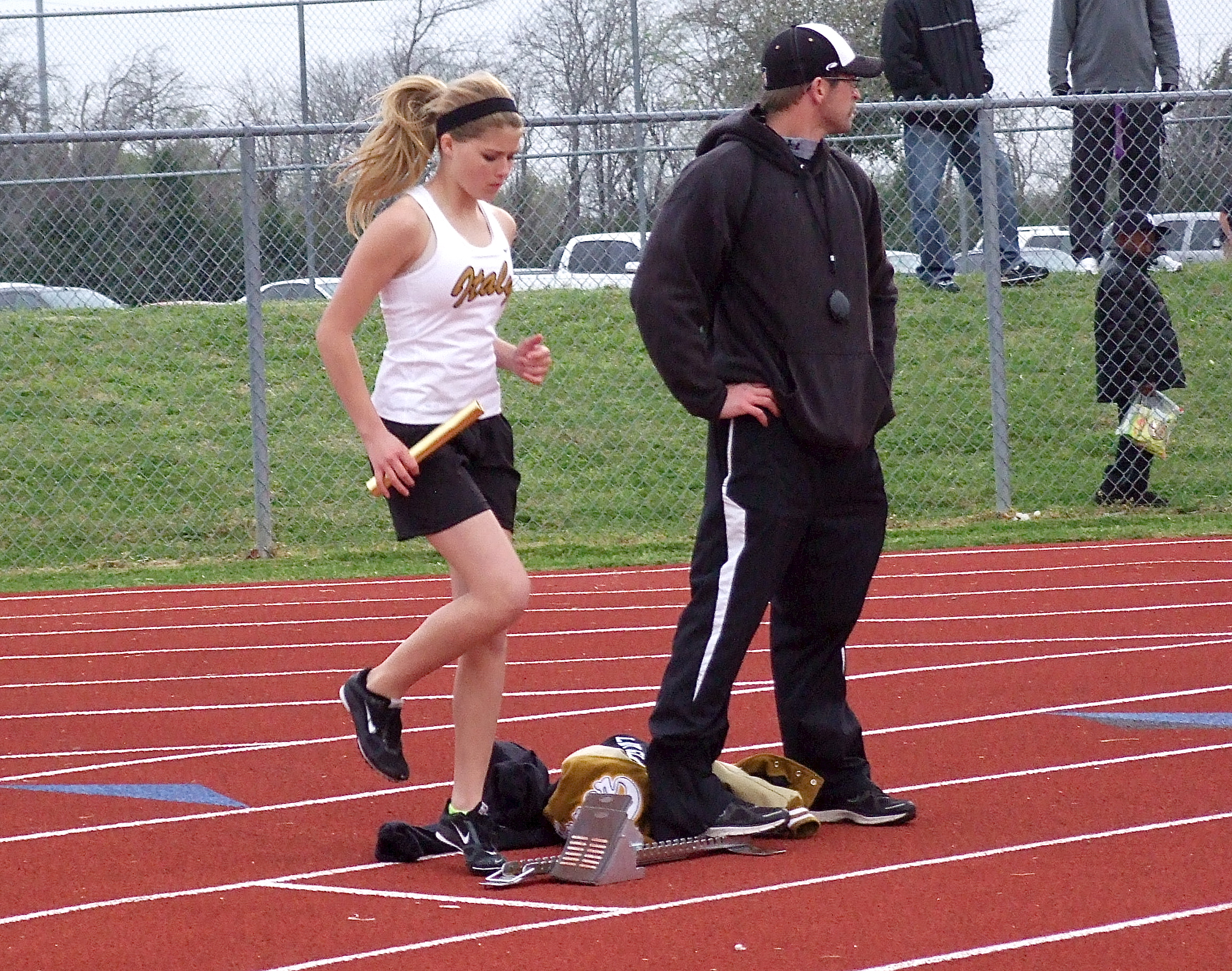 A small group of Italy track stars make a big impression against 4A schools « previous story album next » Coach Nate Skelton is ready to hold the block for Halee Turner who stays warm in the afternoon chill. (Barry Byers) Download original photo