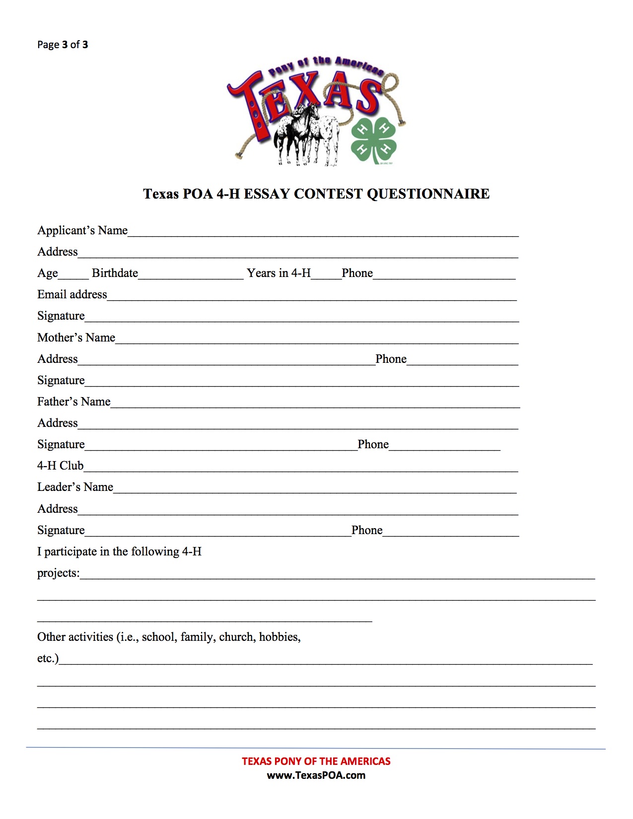 Win a POA—Texas 4-H Essay Contest « previous story album next » Essay Contest Questionnaire (Julie Hinz) Download original photo
