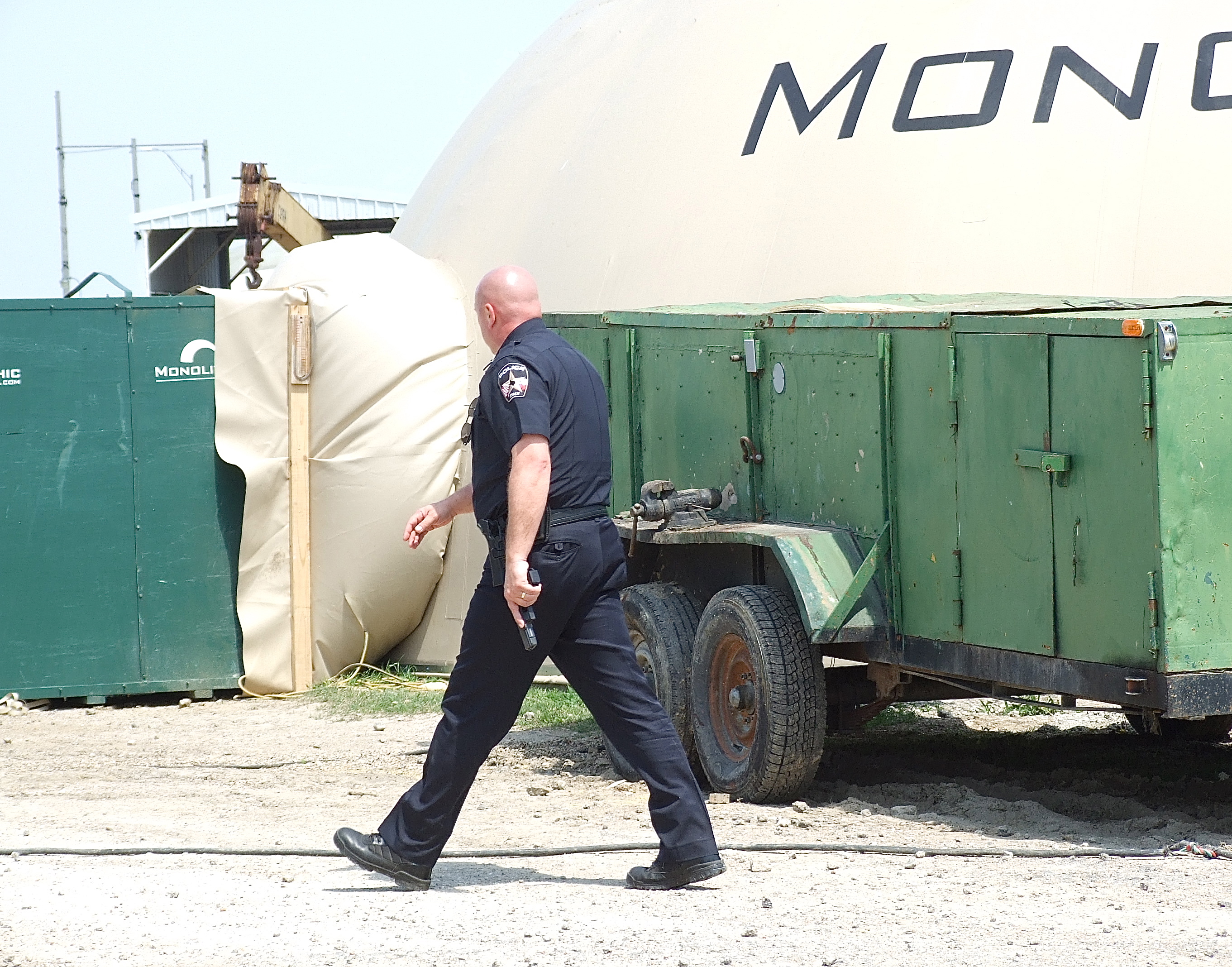 Italy Police Chief Diron Hill has his sidearm drawn as the search for a suspect on the run continues at the headquarters of Monolithic Constructors, Inc. in Italy. (Barry Byers)