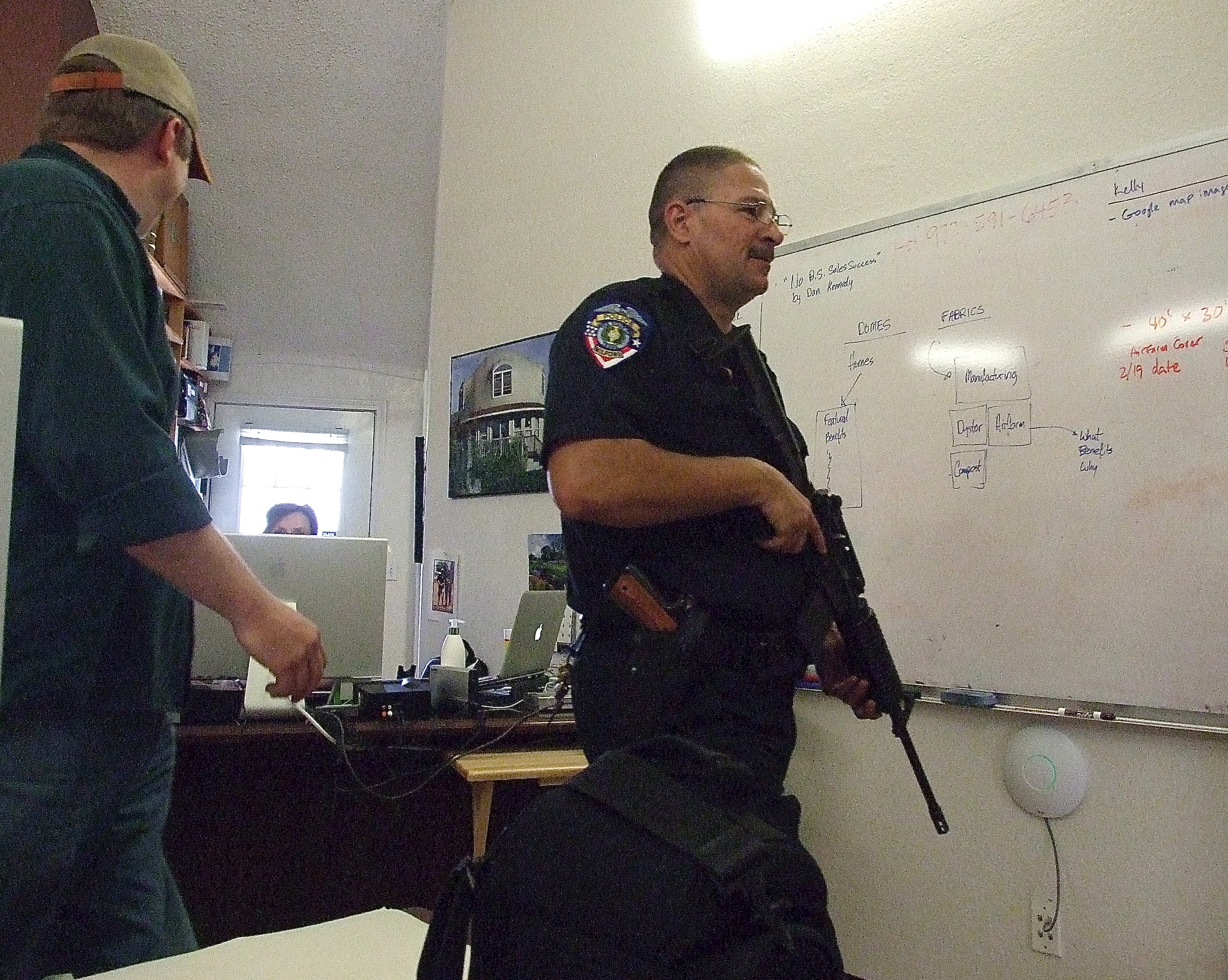 Man hunt ends in successful K-9 search to apprehend suspect at Monolithic campus « previous story album next » Mike South escorts Milford Police Chief Carlos Phoenix in and around the dome -shaped structures during an armed search for a fleeing suspect. (Barry Byers) Download original photo
