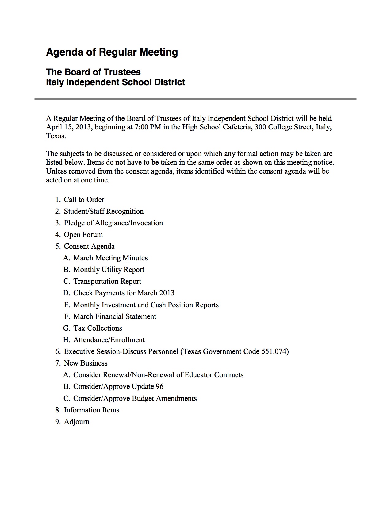 Agenda: Italy ISD School Board Meeting – Monday, April 15, 2013 « previous story album next » Download original photo