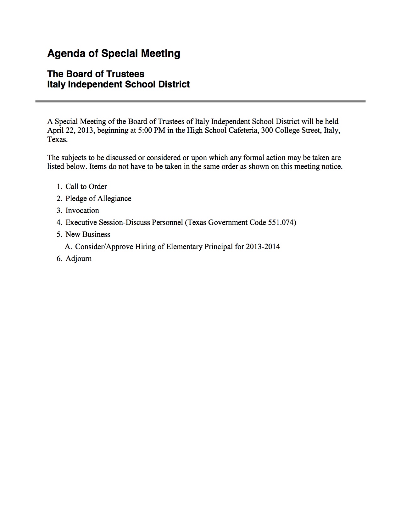 Agenda: Italy ISD Called School Board Meeting, Monday, April 22, 2013 « previous story album next » Download original photo