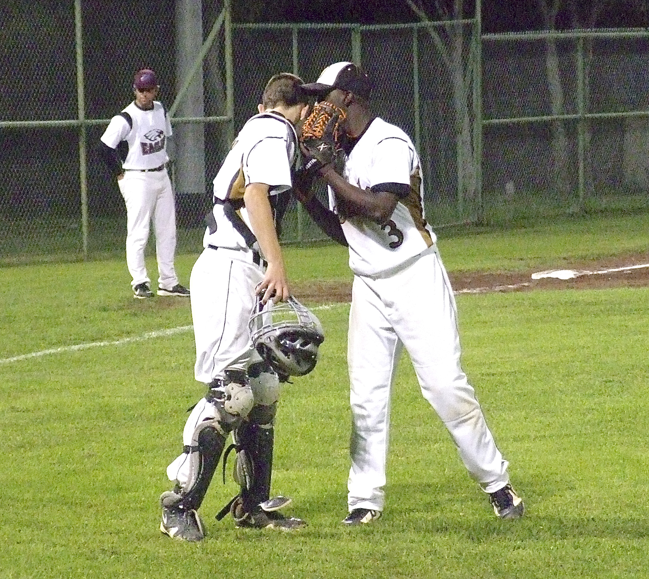 Closing the deal: Senior Marvin Cox(3) and freshman catcher Ryan Connor(17) strategize to get the final strikeout to end Senior Day 2013 with Italy winning 10-4 over the Eagles. (Barry Byers)