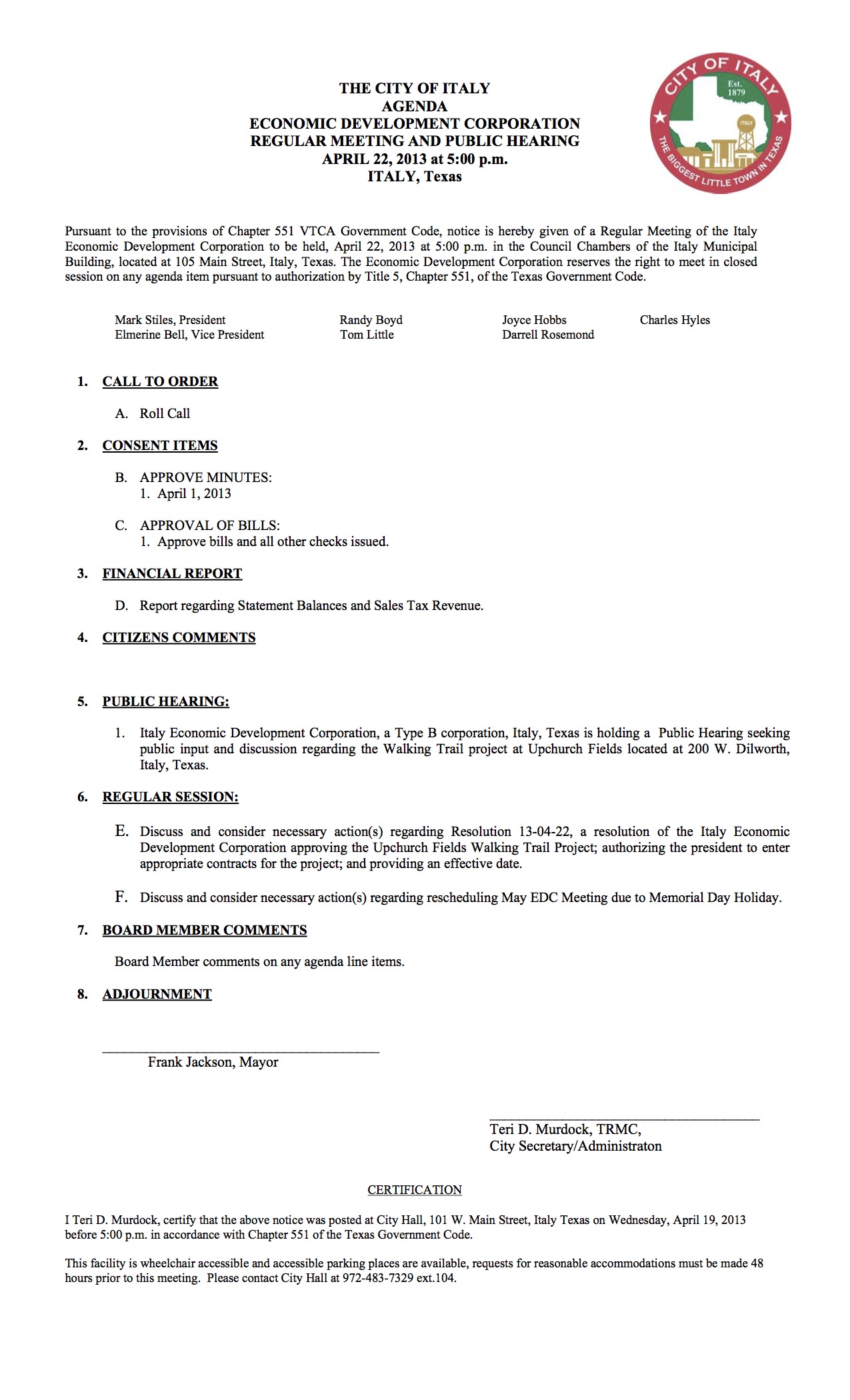Agenda: Italy Economic Development Corporation Meeting, Monday, April 22, 2013 « previous story album next » Download original photo