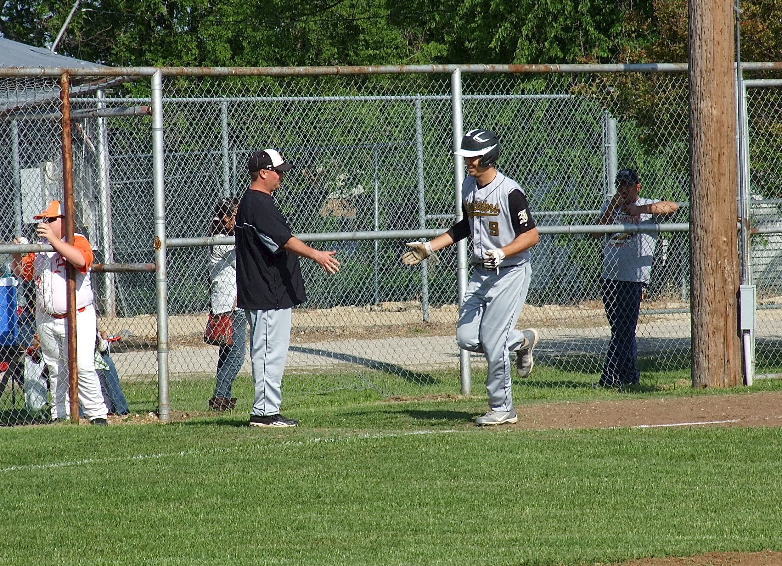 Cole Hopkins gets congratulated by head coach Josh Ward as he rounds third base and then trots home to complete his, “It’s outta-here,” homer against Avalon. (Barry Byers)