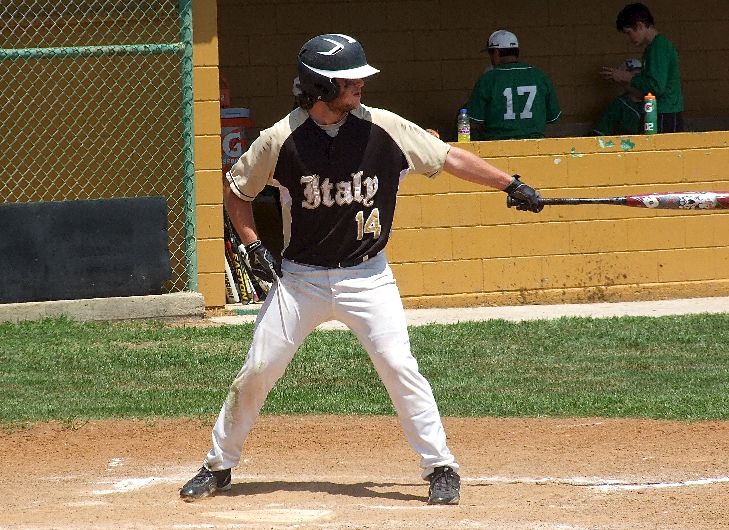 Italy’s JV Baseball team learns on the fly during a pair of home games « previous story album next » Kyle Fortenberry(14) is not holding anything back against Clifton. (Barry Byers) Download original photo