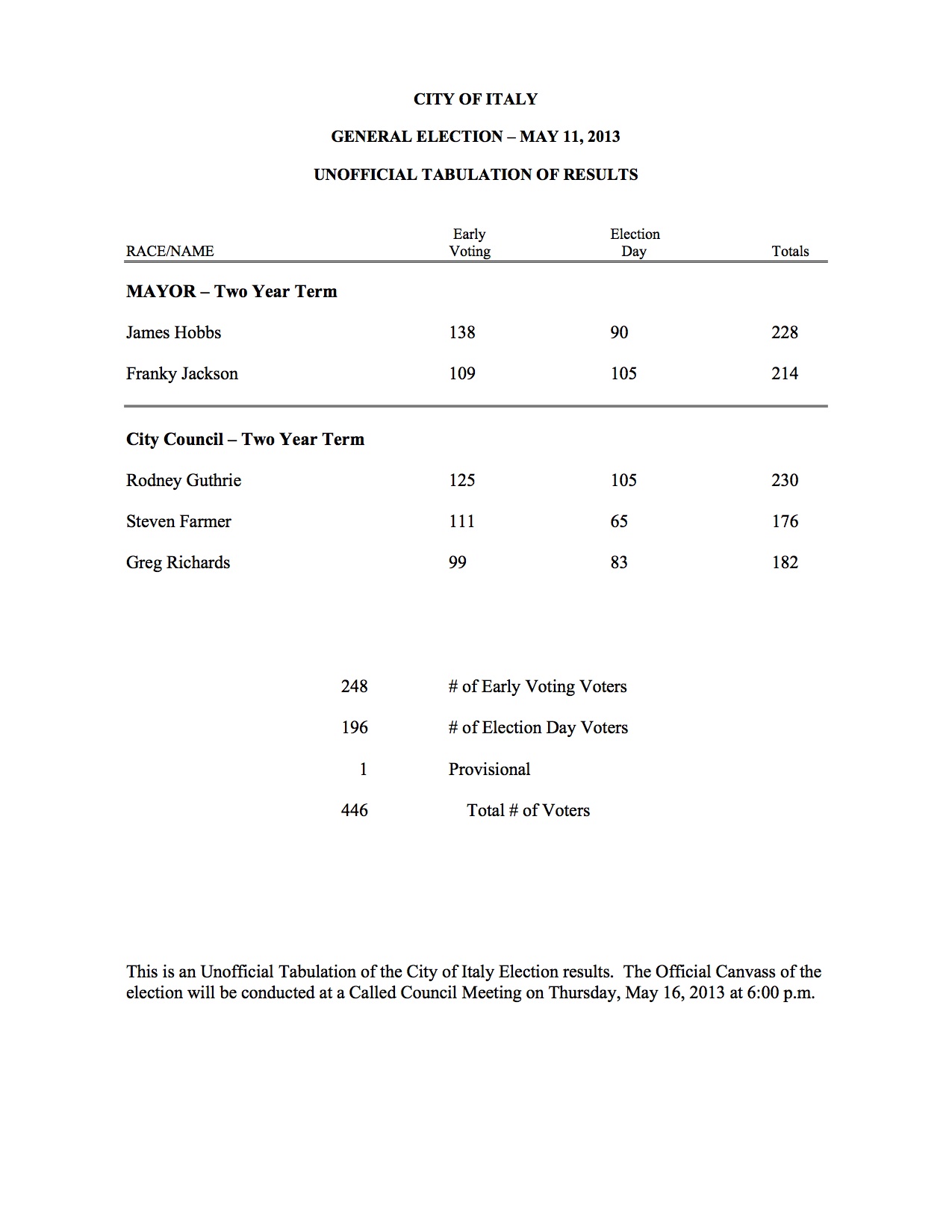 Official Election Results – May 11, 2013