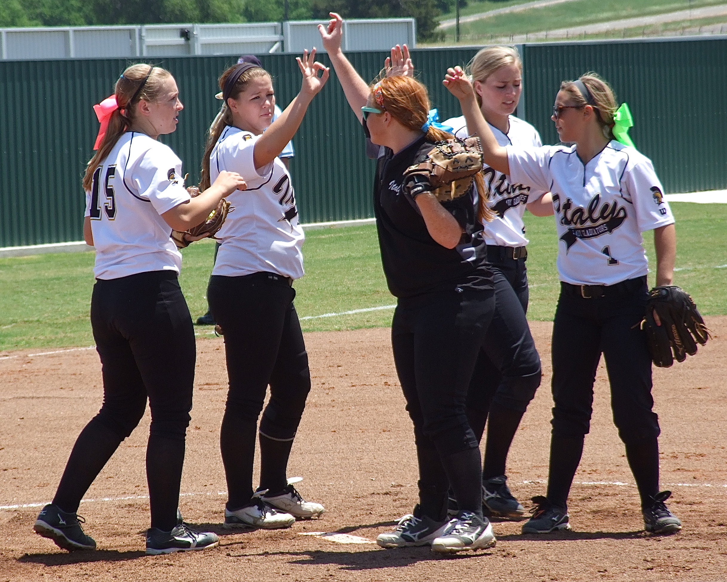 Lady Gladiators fall in three to Bosqueville « previous story album next » Italy’s infielders consisting of Jaclynn Lewis(15), Paige Westbrook(10), Katie Byers(13), Madison Washington(2) and Bailey Eubank(1) want that third out. (Barry Byers) Download original photo