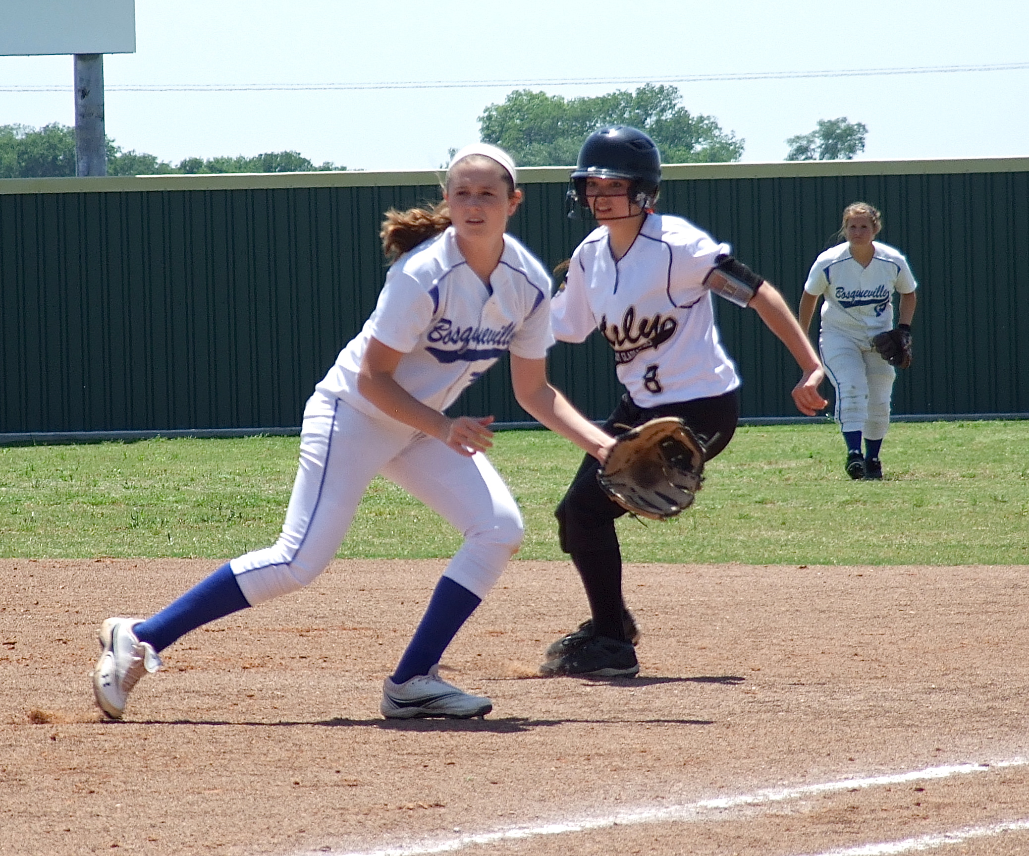 Lady Gladiators fall in three to Bosqueville « previous story album next » Lady Gladiator Morgan Cockerham(8) looks for a chance to reach second base. (Barry Byers) Download original photo
