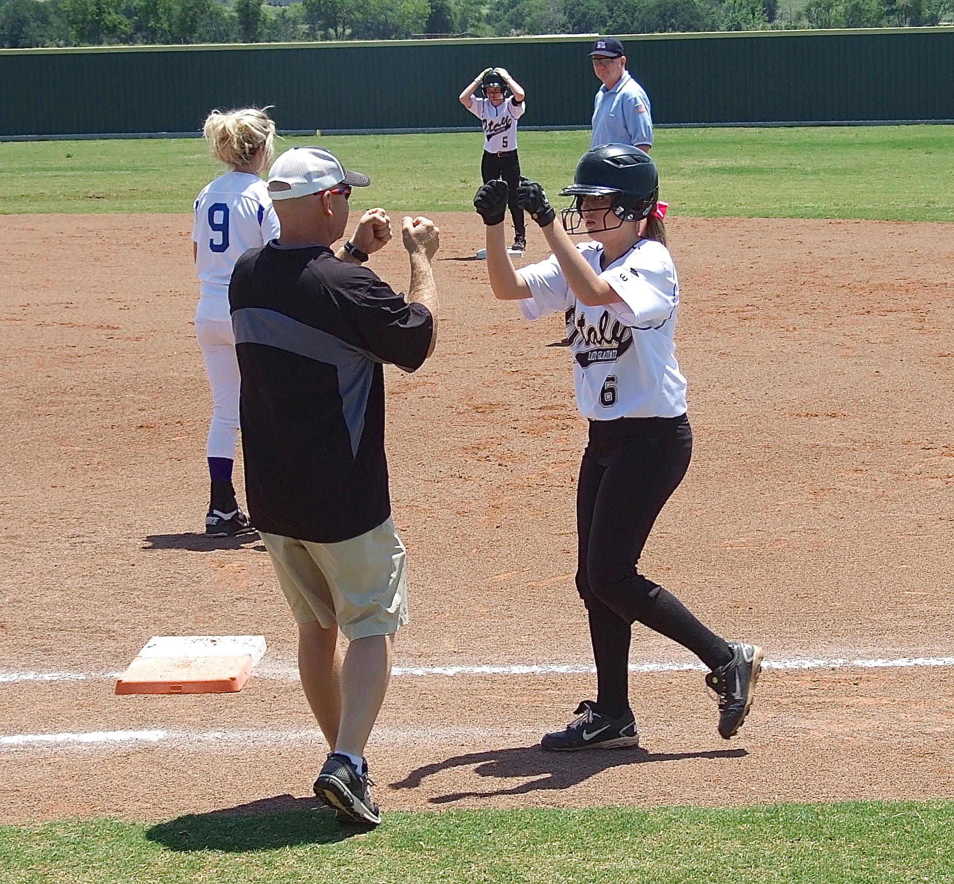 More memories from the Lady Gladiators and their final moments of 2013 « previous story album next » Hannah Washington(6) gets on base with a single and advances teammate Tara Wallis(5) to second base. (Barry Byers) Download original photo