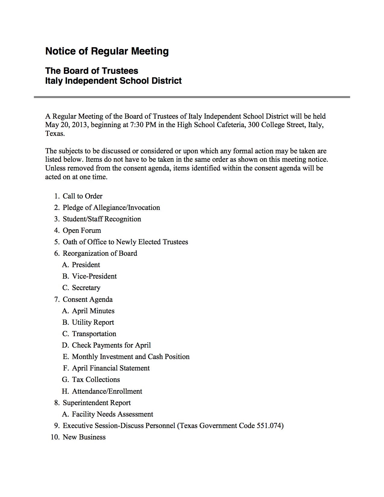 Agenda: Italy ISD School Board Meeting – Monday, May 20, 2013 « previous story album next » Agenda – page 1 Download original photo