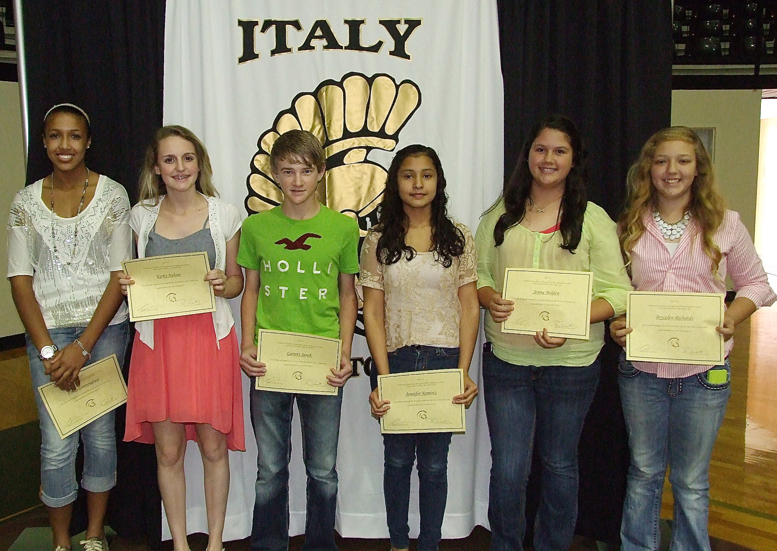 The honors continue from the Italy Junior High Awards ceremony « previous story album next » 7th grade Social Studies students awarded for achieving All A’s are Emily Cunningham, Kirby Nelson, Garrett Janek, Jennifer Ramirez, Jenna Holden and Brycelen Richards. (Barry Byers) Download original photo