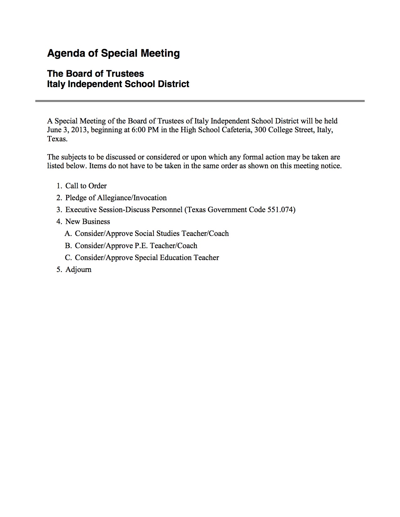 Agenda: Italy ISD School Board Called Meeting – Monday, June 3, 2013 « previous story album next » Download original photo