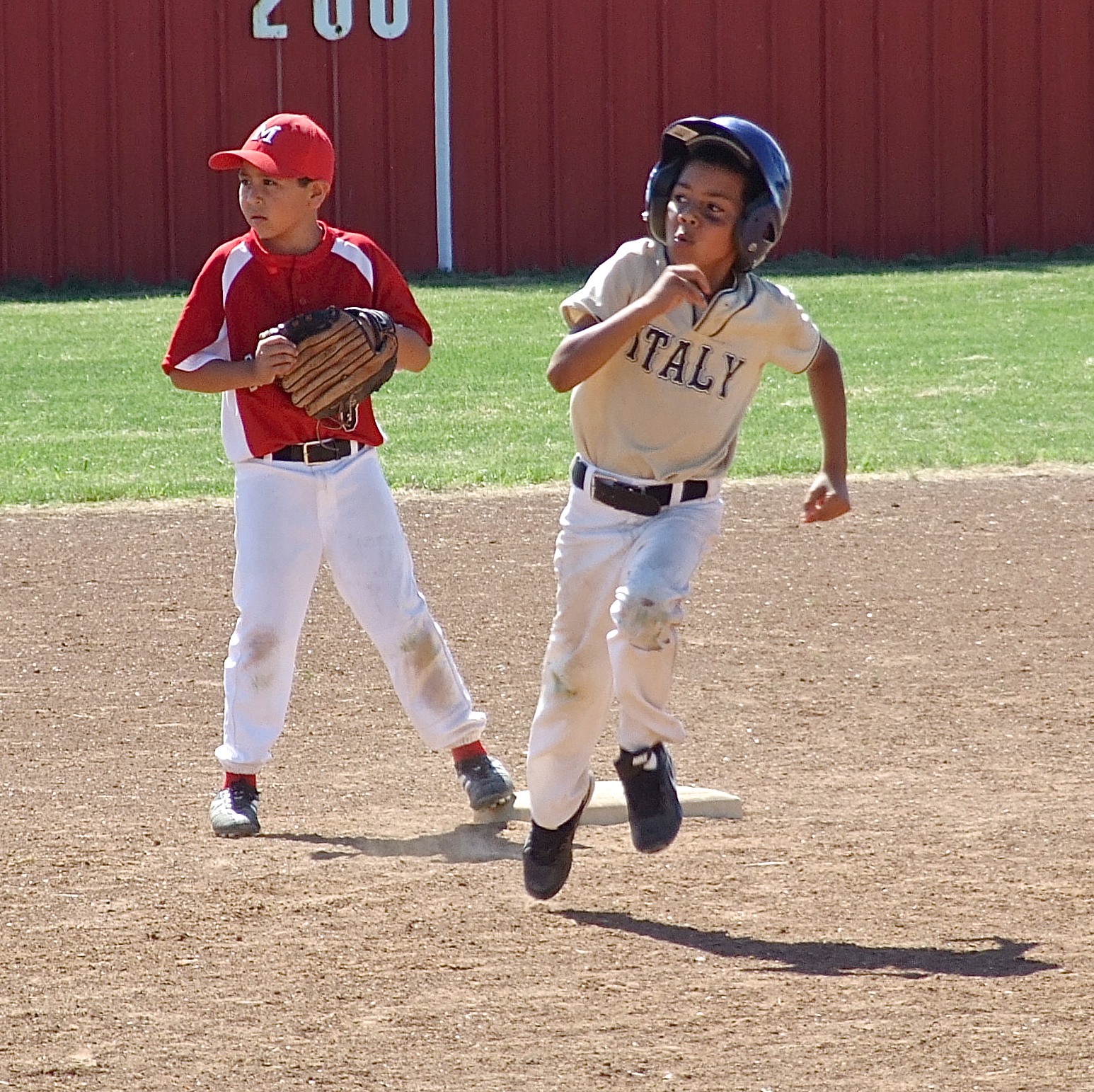 Italy Gold’s, Jalyn Wallace(1), rounds second base on his way to an inside the park home run against Maypearl to help propel Italy to a 8U boys championship victory. (Barry Byers)