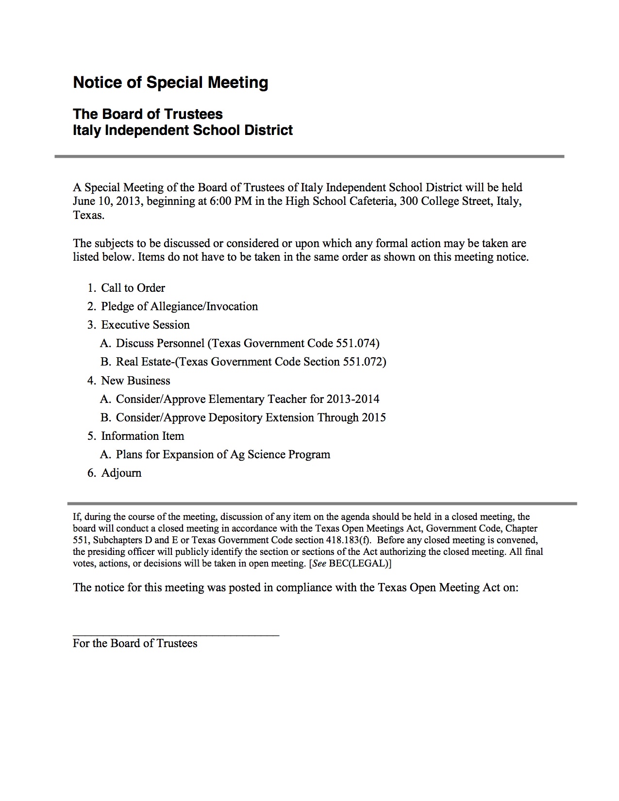 Agenda: Italy ISD School Board Called Meeting – Monday, June 10, 2013 « previous story album next » Download original photo