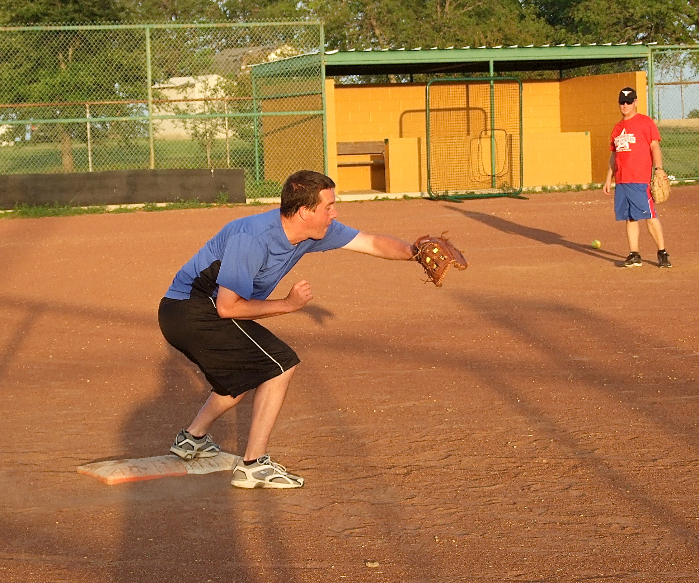 Josh Droll makes the grab at first base for a simulation out. Droll and his Italy Firefighter teammates are looking to avoid a repeat of last year’s loss to the Italy Police Department during the 1st annual Guns vs. Hoses charity event. (Barry Byers)