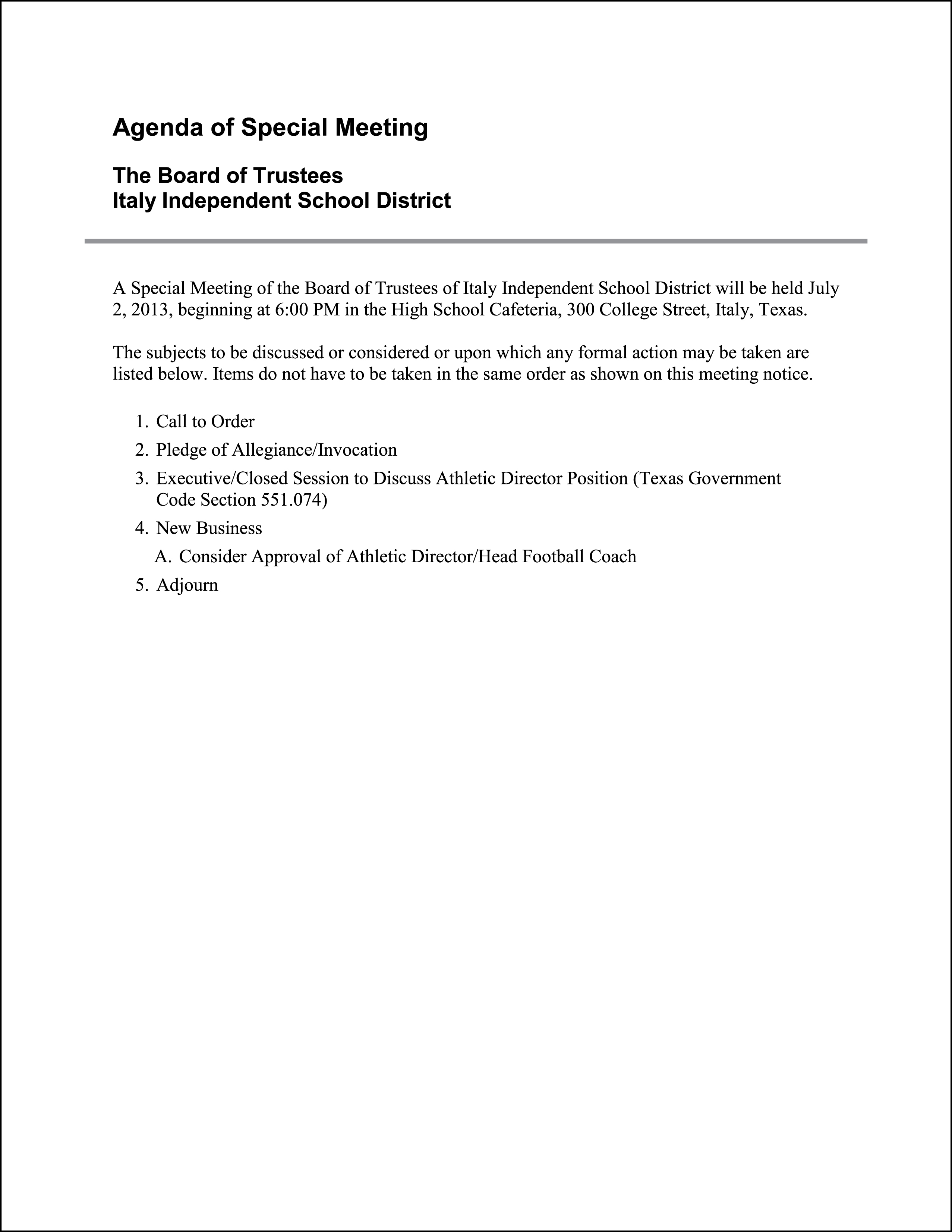 Agenda: Italy ISD School Board Called Meeting, Tuesday, July 2, 2013