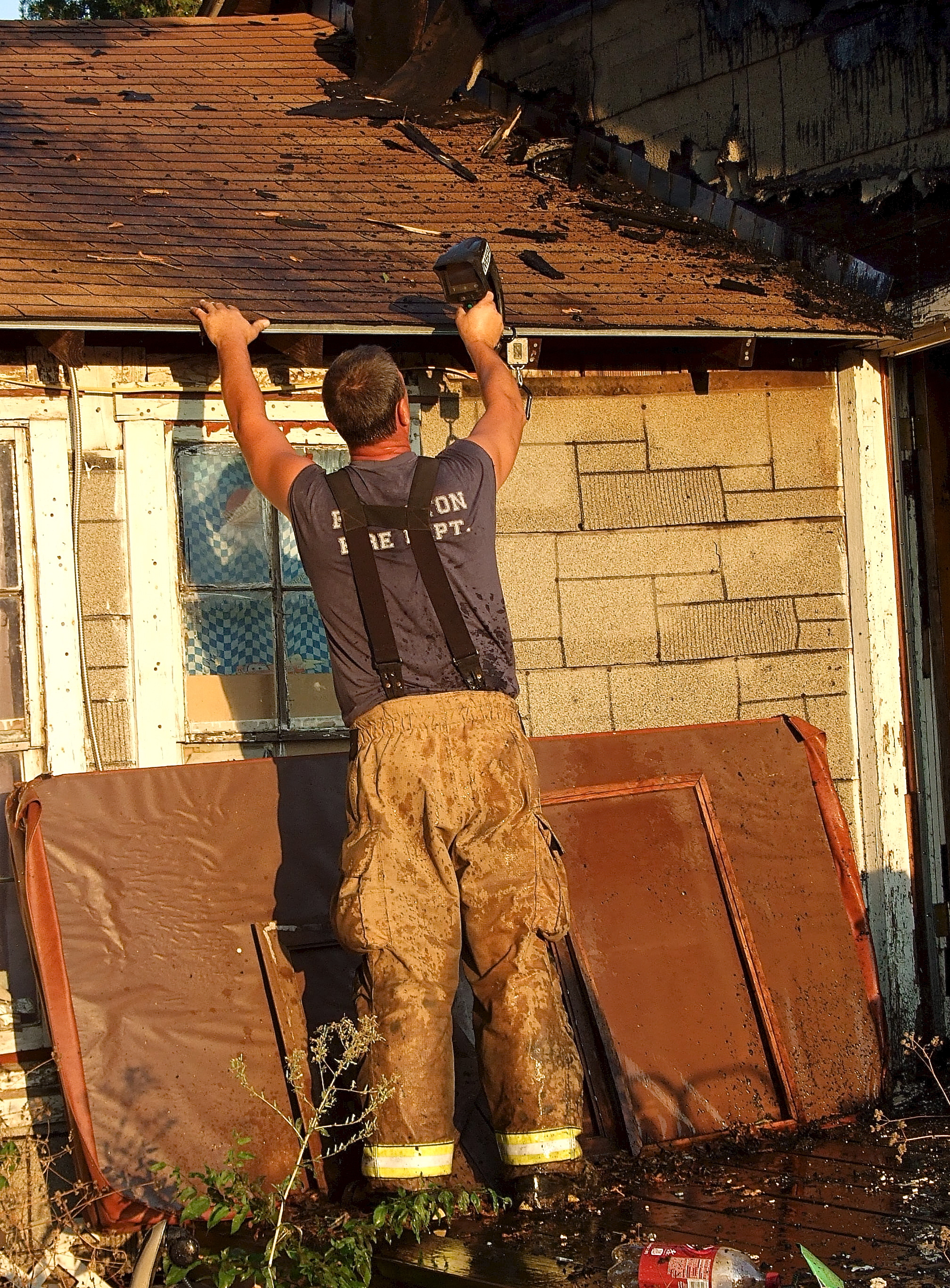 Morning porch fire becomes a shocking alarm clock for local family « previous story album next » Forreston firefighter, Bobby McBride, uses a thermal imaging camera to record the damage. (Barry Byers) Download original photo