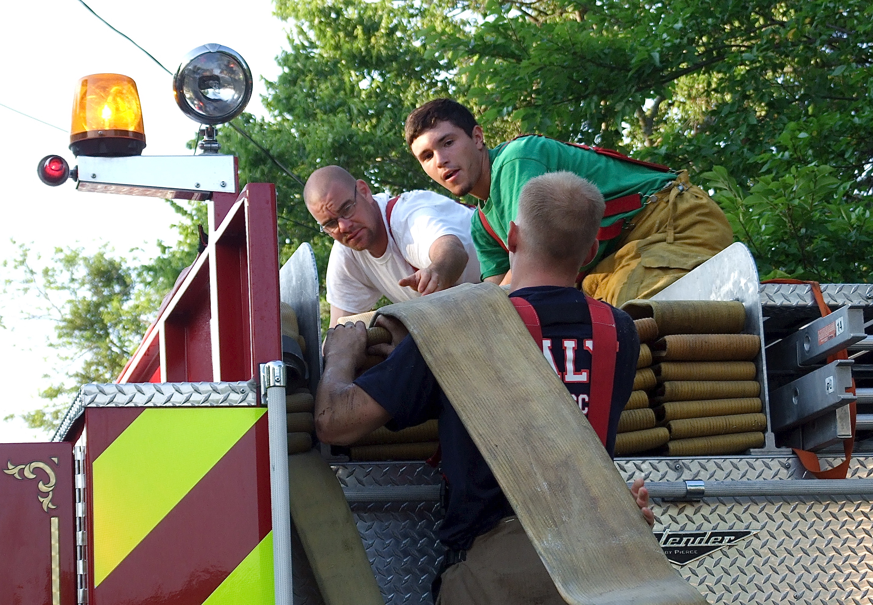 Morning porch fire becomes a shocking alarm clock for local family « previous story album next » Bryan Ward lifts the fire hose up to Brad Chambers and Brandon Jacinto who fold the hose back into place atop the fire truck. (Barry Byers) Download original photo