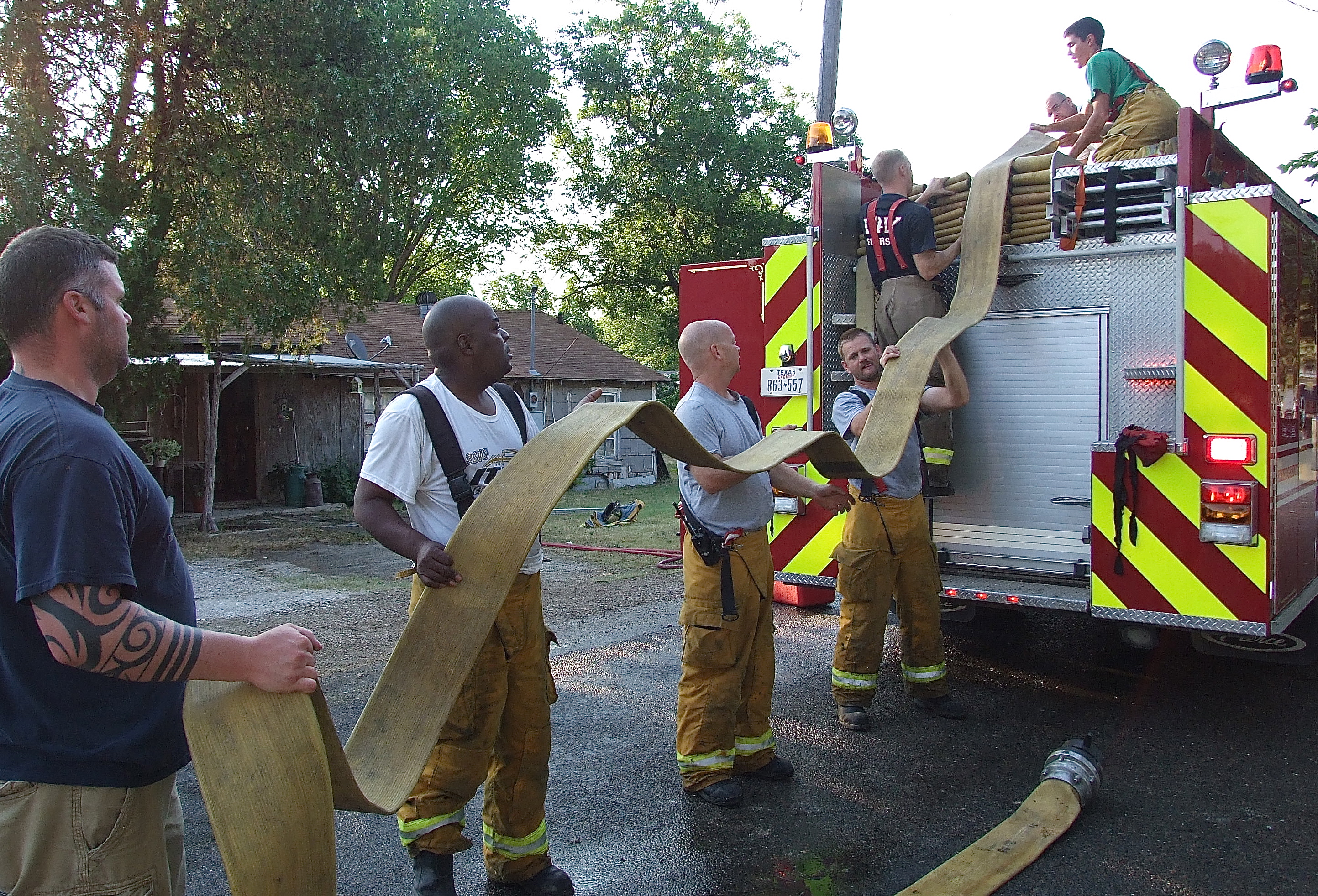 Firefighters Justin Roberts, Lynn Lambert, Michael Chambers, Daniel Ballard, Bryan Ward, Brandon Jacinto and Brad Chambers work in unison to load the fire hose back onto the fire truck. (Barry Byers)