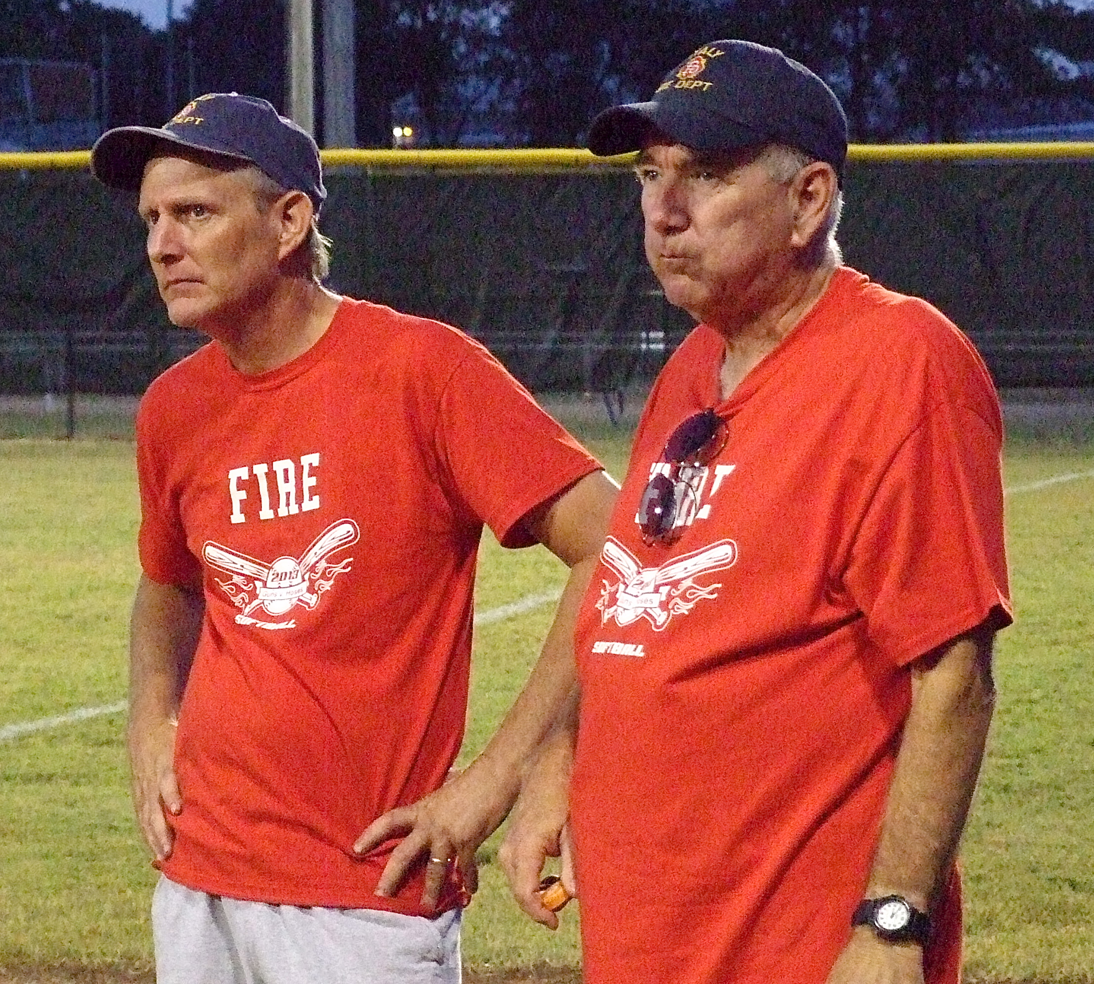 Additional moments from the Italy P.D.’s 2nd Annual Guns vs. Hoses Softball Game « previous story album next » Firefighter Randy Boyd and Italy Fire Chief/Coach Donald Chambers realize all you can do know is throw some water on it and let it play itself out. (Barry Byers) Download original photo