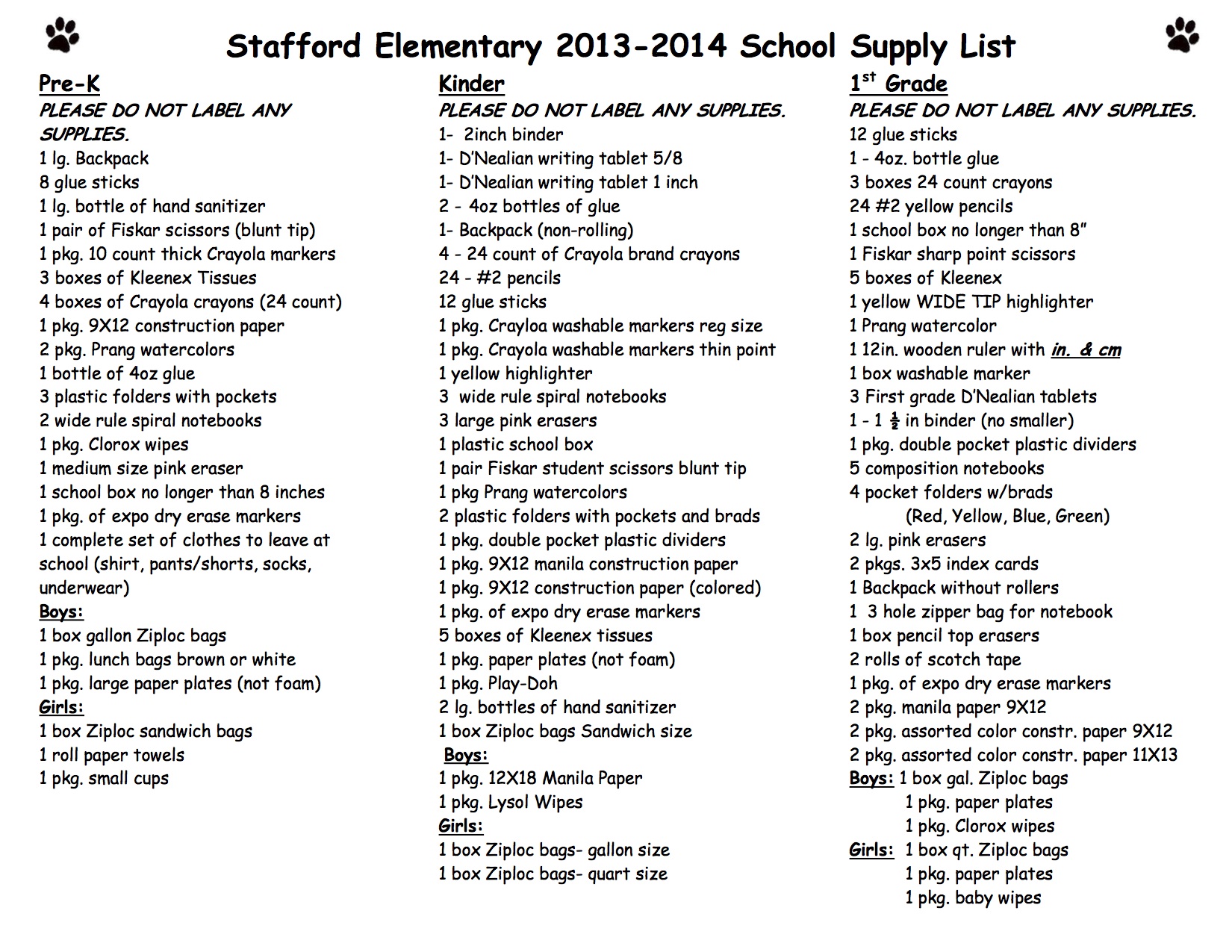 School Supply Lists released from Stafford Elementary « previous story album next » Stafford Elementary School Supply List – page 1 For optimal printing click on image twice to get it to it’s largest state. Then right click, download and print. Download original photo