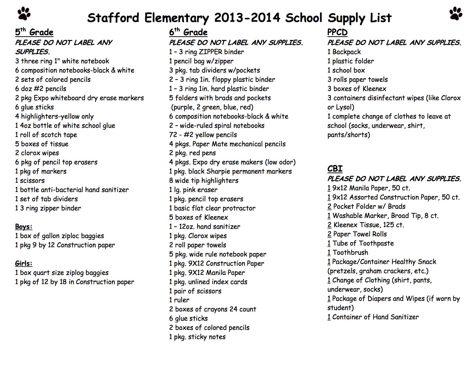 School Supply Lists released from Stafford Elementary « previous story album next » Stafford Elementary School Supply List – page 3 For optimal printing click on image twice to get it to it’s largest state. Then right click, download and print. Download original photo