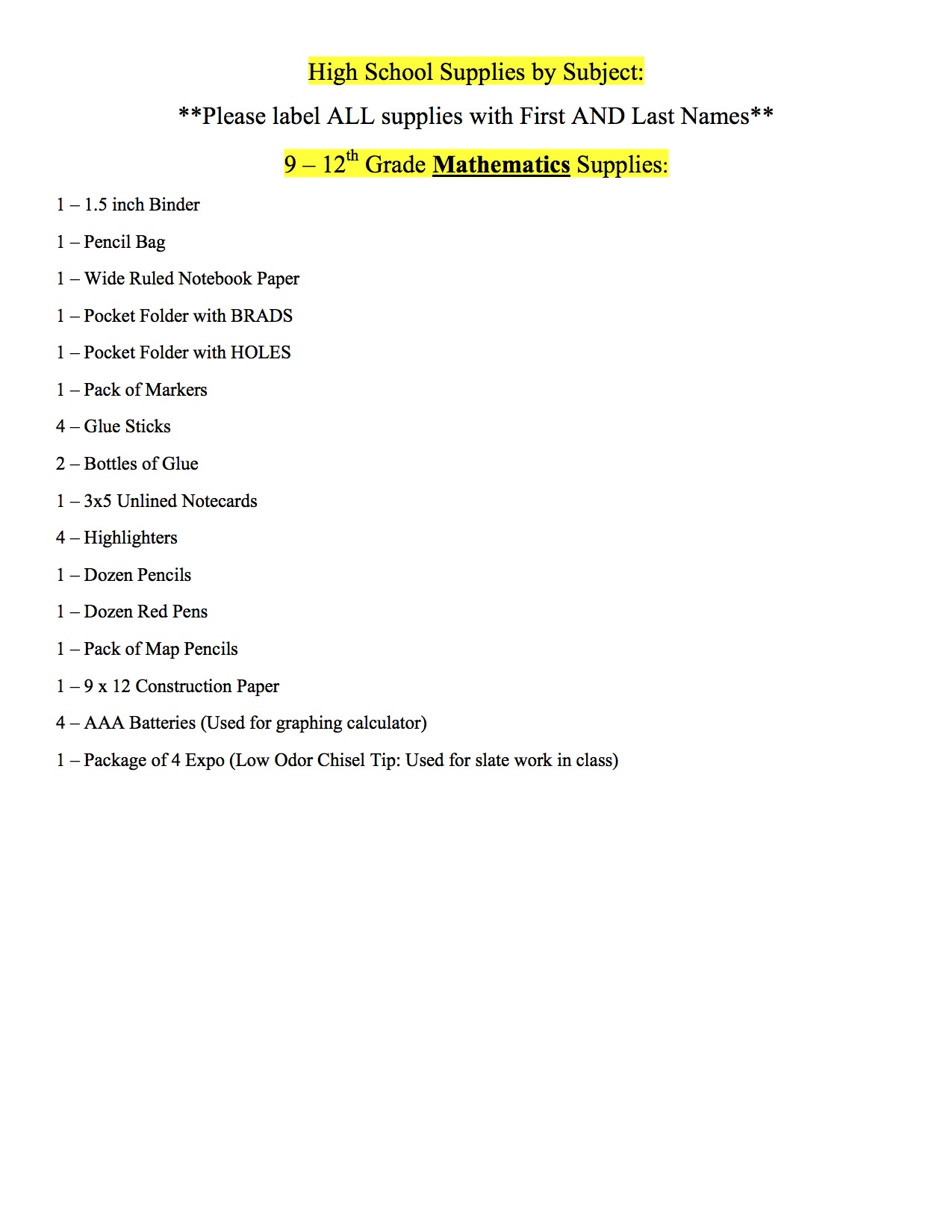 Italy High School/Junior High School supply lists for the 2013-2014 school year