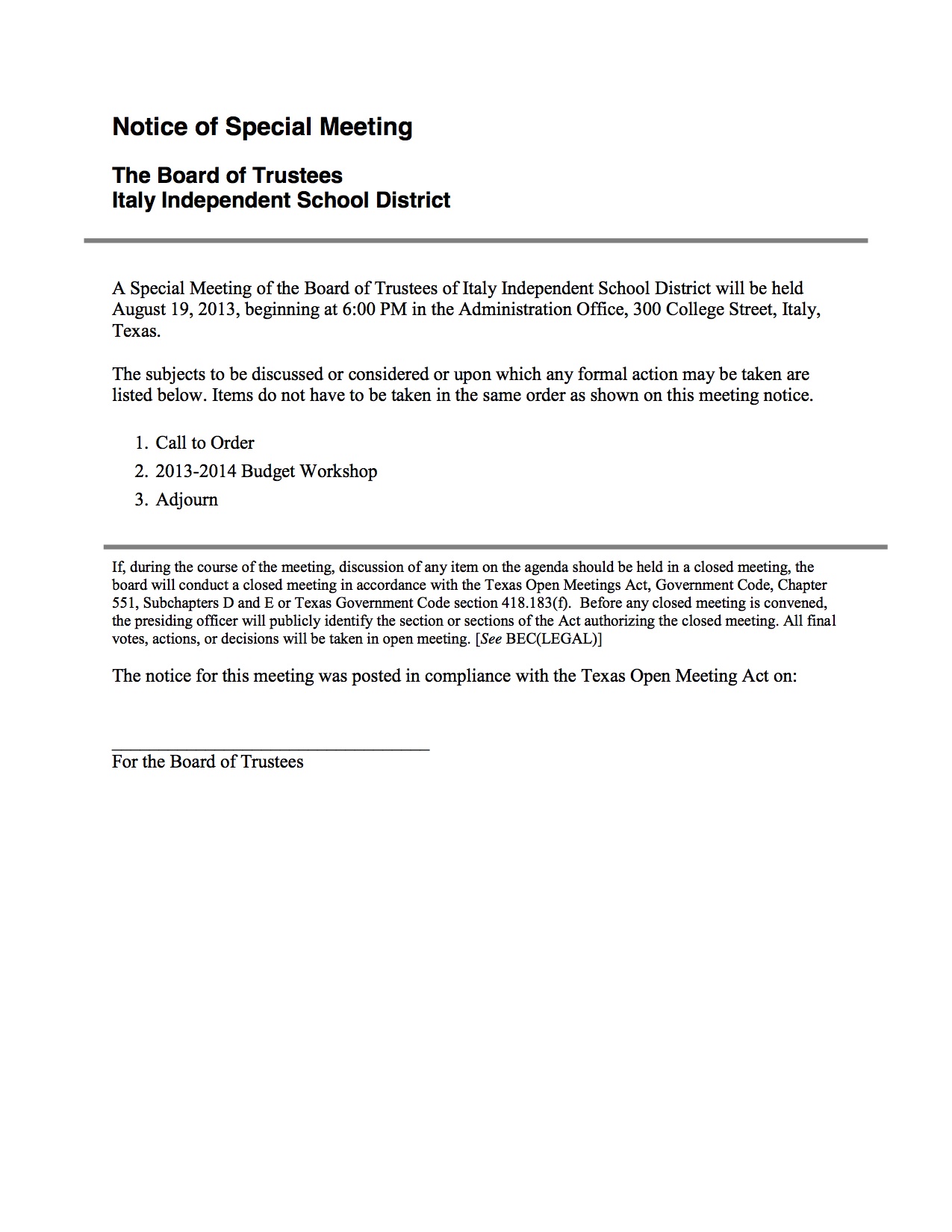Agendas: Italy ISD School Board Budget Workshop/Meeting, Monday, August 19, 2013 « previous story album next » Budget Workshop Agenda Download original photo