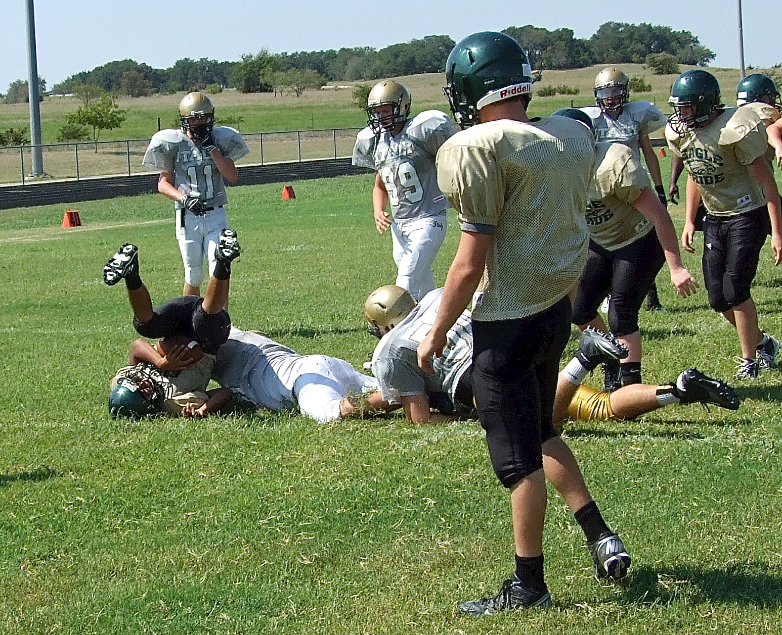 With Valley Mills desperate to put points on the board and trying to open their offensive play book, Italy’s Zain Byers(60) closes the door on an Eagle runner and slams him into the turf. (Barry Byers)
