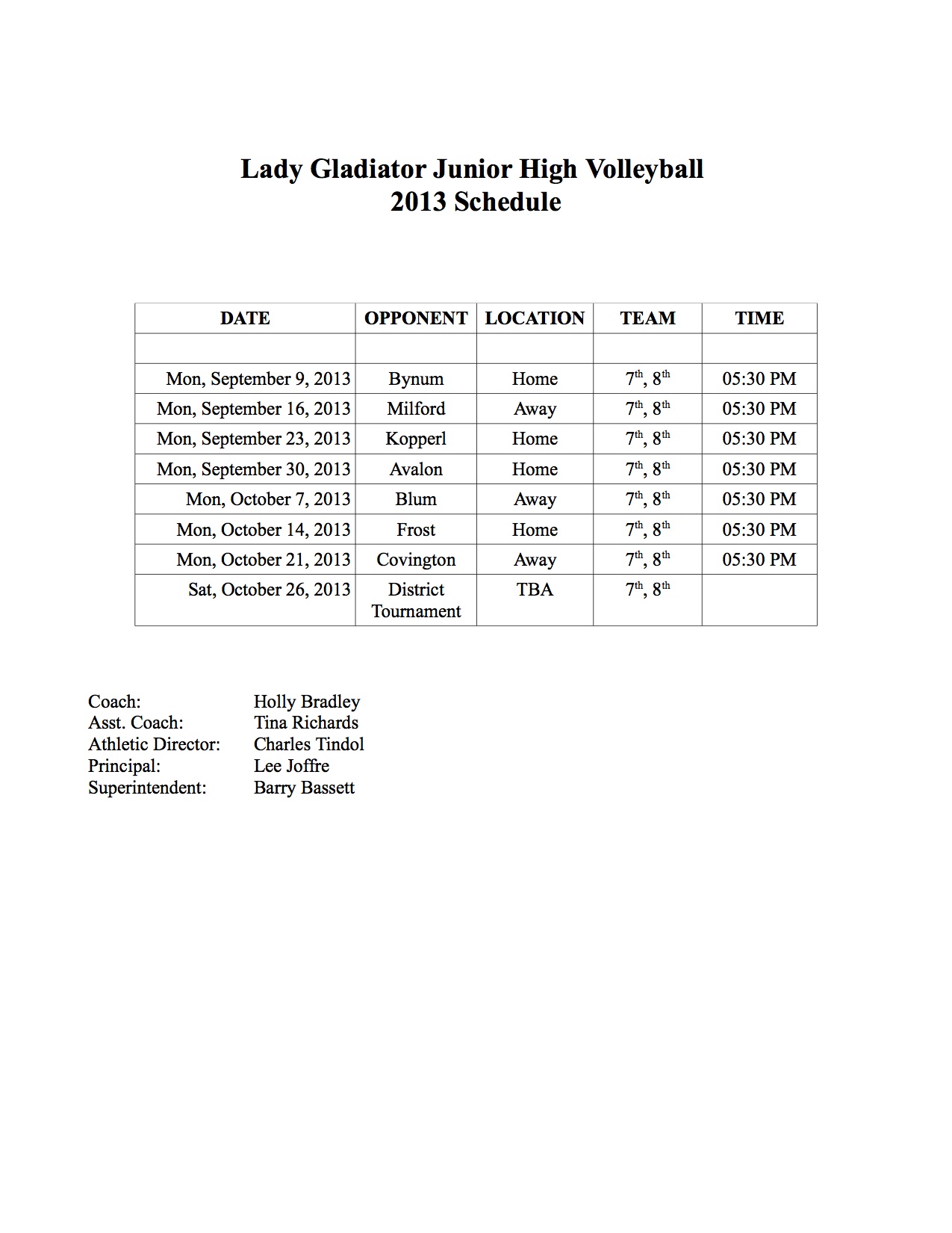 Lady Gladiator Junior High Volleyball schedule for 2013 « previous story album next » Download original photo