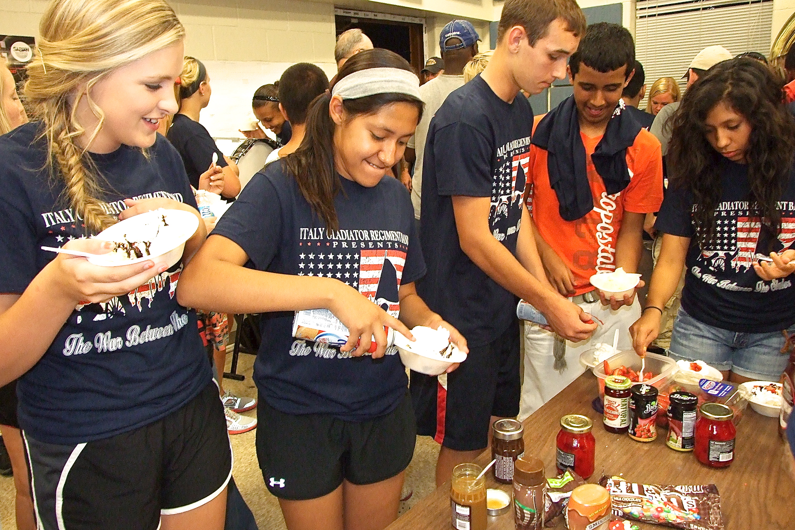 Annie Perry, Marlen Hernandez, Ryan Connor, Jorge Galvan and Julissa Hernandez attempt to operate the CoolWhip can as the ice cream part of the Band’s Social gets underway inside the band hall. (Barry Byers)