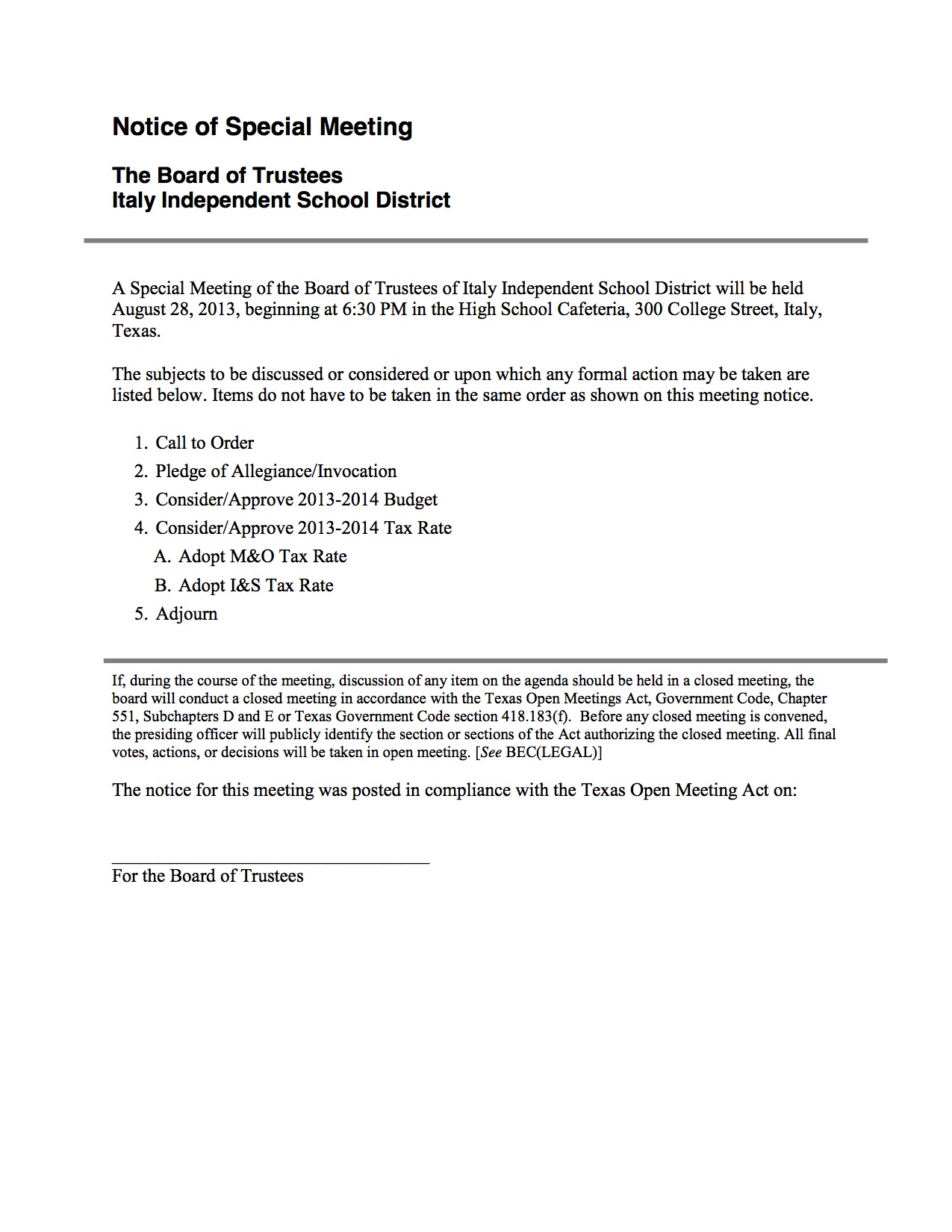Agendas: Italy ISD School Board Budget Workshop/Hearing and Meeting « previous story album next » Agenda – Meeting – Wednesday, August 28 Download original photo