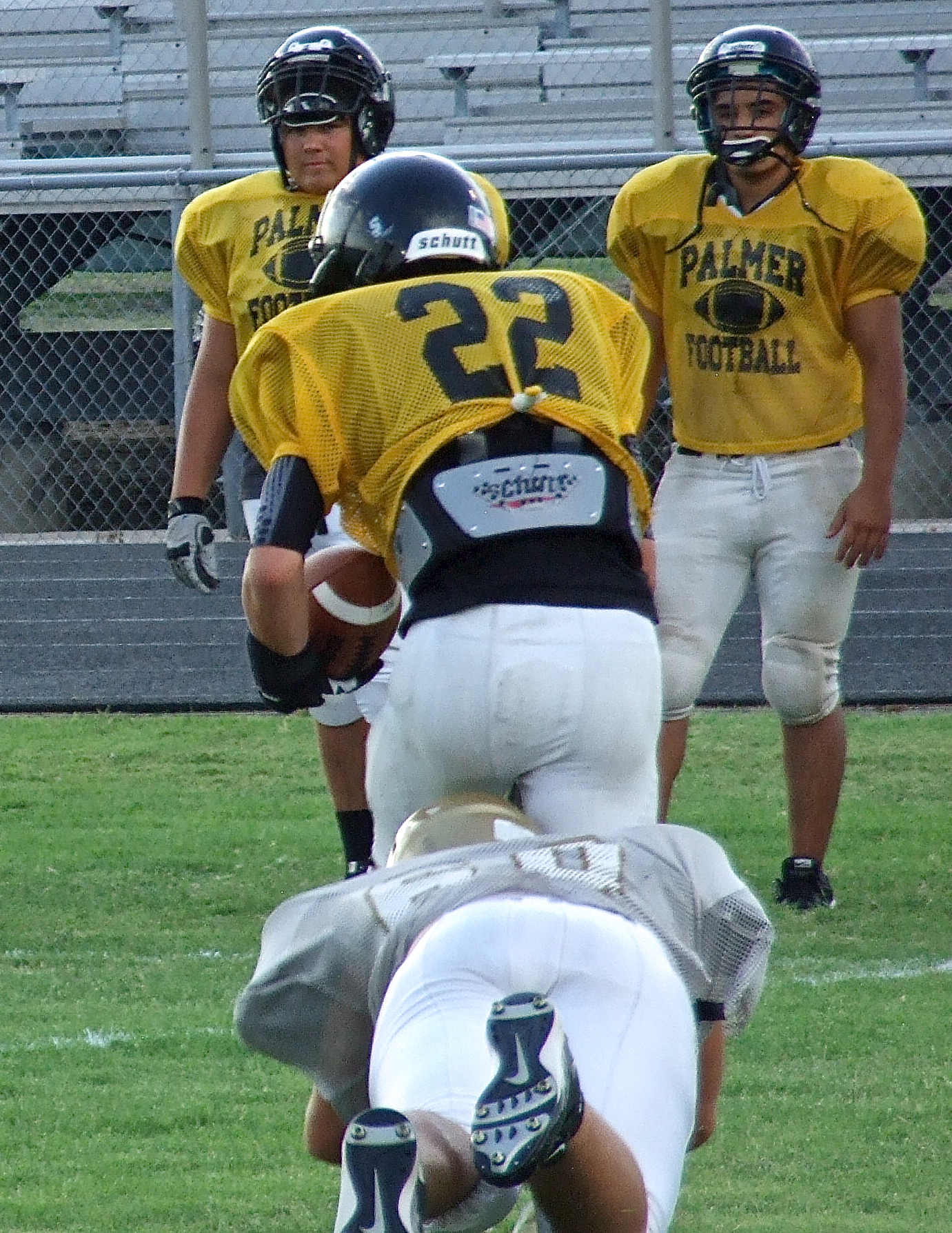 Italy’s All-State senior defensive end Zain Byers(60) shows his versatility by making a tackle from behind on the slot receiver and holds Palmer to minimal gain on a quick-pass play the Bulldogs tried on the scrimmage’s opening play. (Barry Byers)