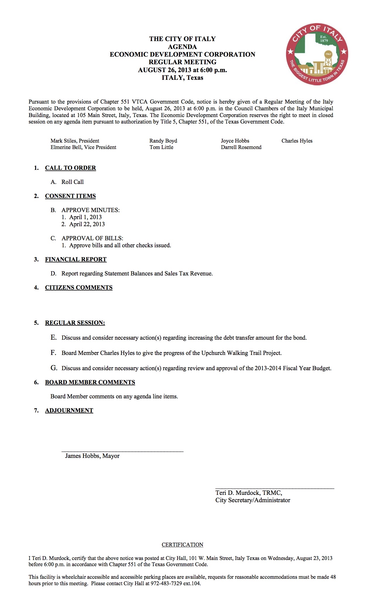 Agenda: Italy Economic Development Corporation Meeting, Monday, August 26, 2013 « previous story album next » Download original photo
