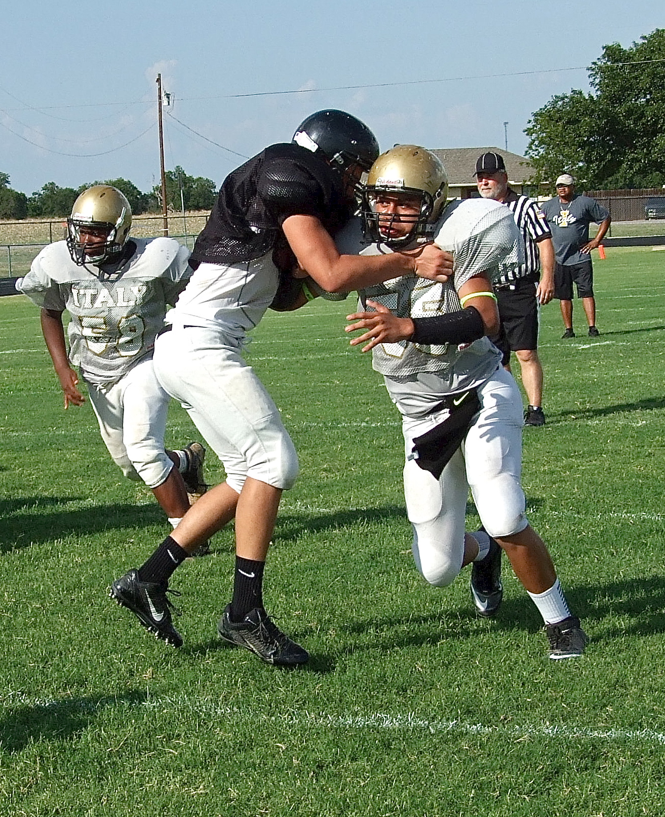 Italy’s JV Gladiators struggle to shake off the Bulldogs in 1-0 scrimmage loss « previous story album next » Linebacker Kenneth Norwood, Jr.(58) and Defensive-end David De La Hoya(55) attack the Palmer backfield. (Barry Byers) Download original photo