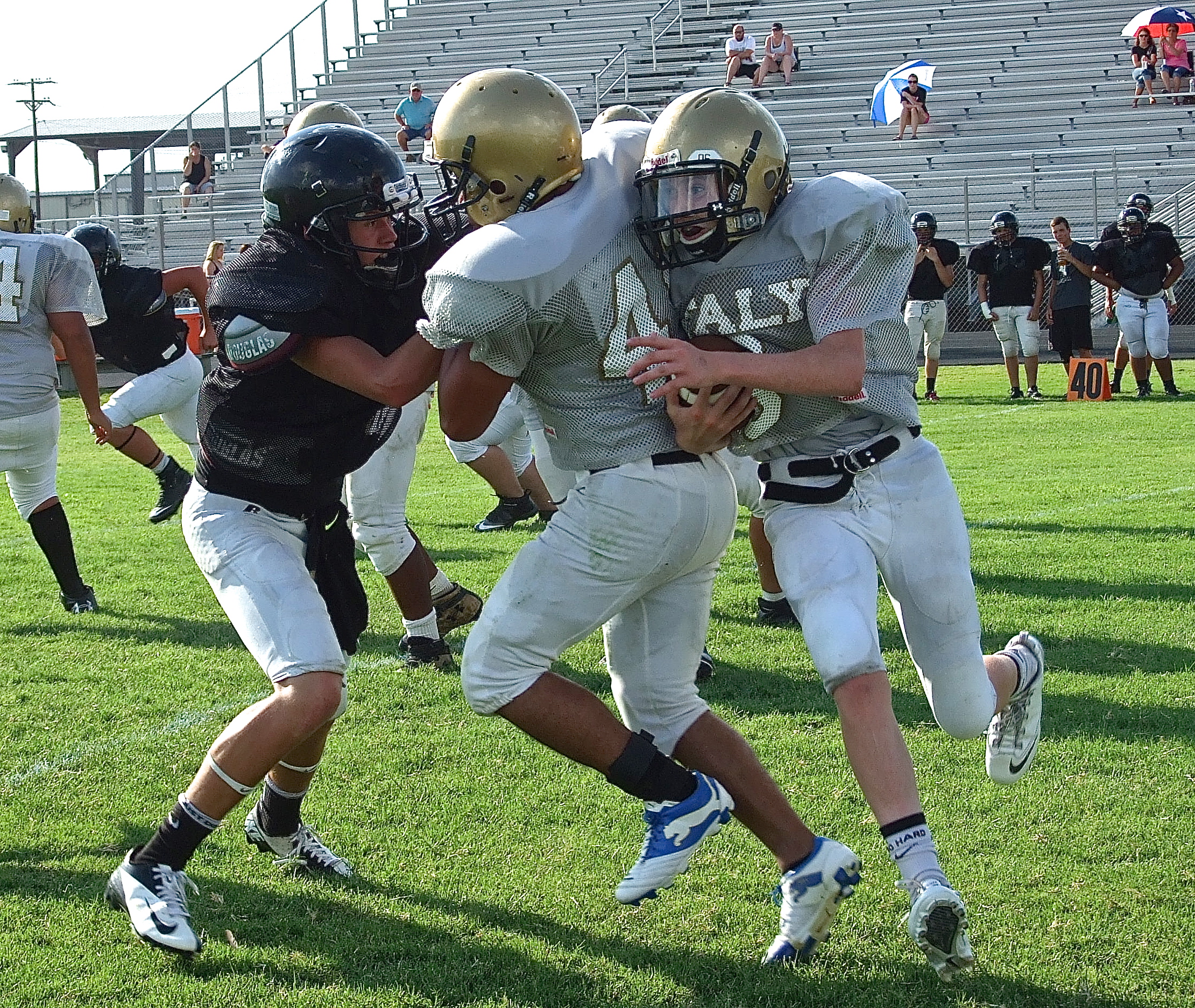 Italy’s JV Gladiators struggle to shake off the Bulldogs in 1-0 scrimmage loss « previous story album next » Italy’s Jorge Galvan(42) tries to spring Clayton Miller around the edge. (Barry Byers) Download original photo