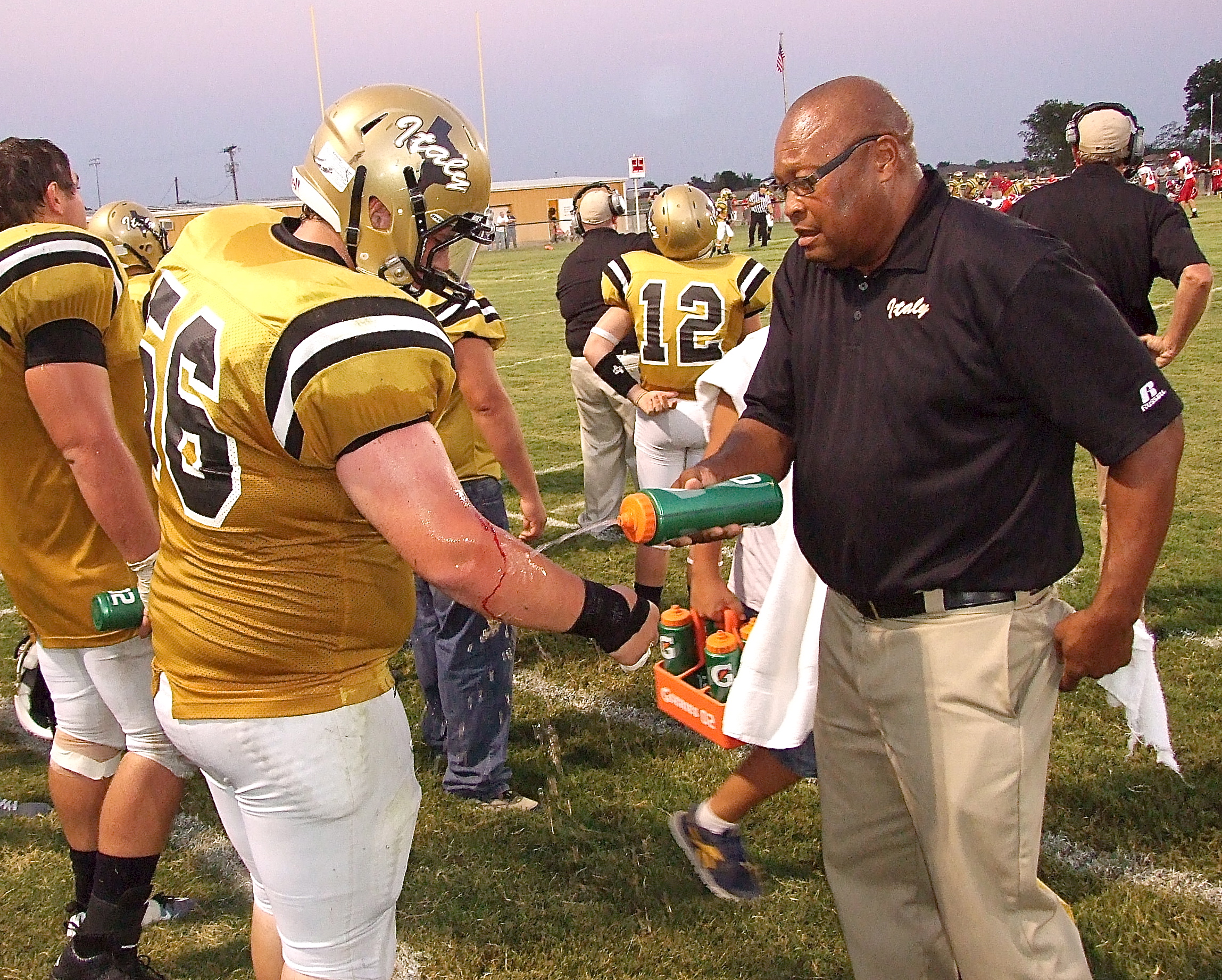 Injured again? John Byers(56) is forced back out of the game with a cut on his arm after returning for one play after having a dislocated finger reset. Assistant coach Larry Mayberry, Sr., acts as the cut man for the king’s of the world. (Barry Byers)