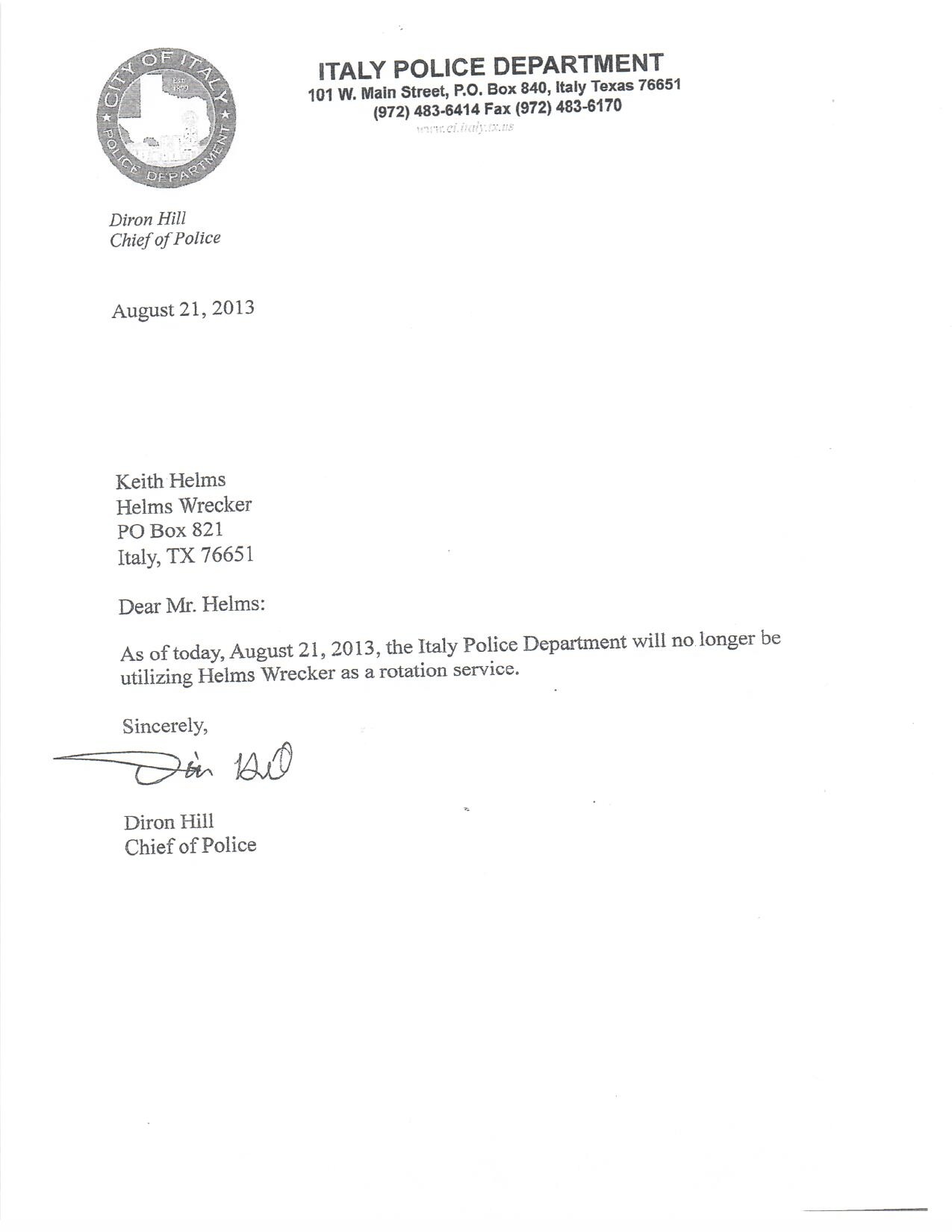 From the publisher: What is really going on at Italy City Hall? « previous story album next » Helms Wrecker removal from service letter Download original photo