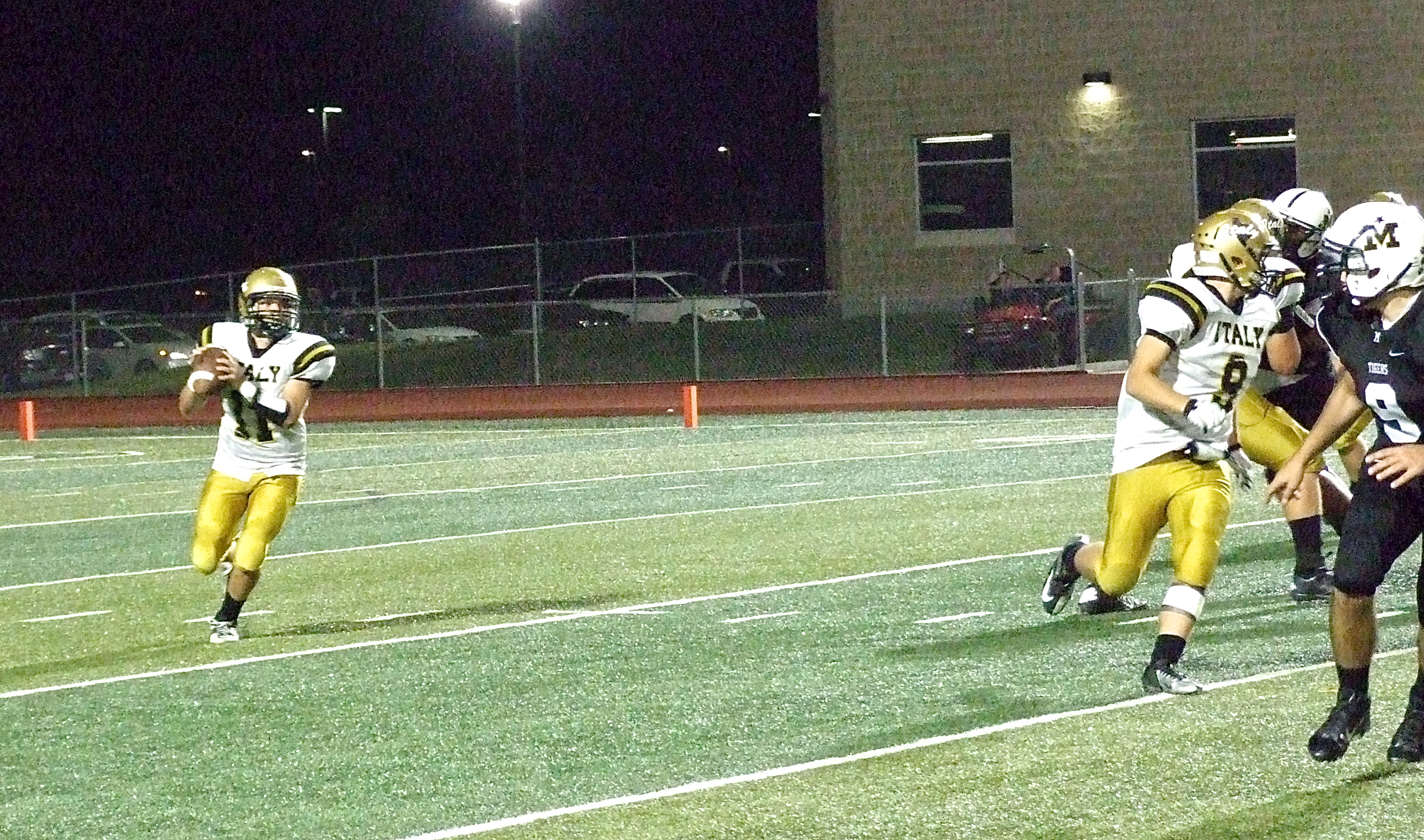 Gladiators enjoy center stage during Dale Hansen Classic but Malakoff gets win « previous story album next » Gladiator quarterback Tyler Anderson(11) rolls out and searches for a receiver with teammate Hunter Merimon(9) offering protection. (Barry Byers) Download original photo