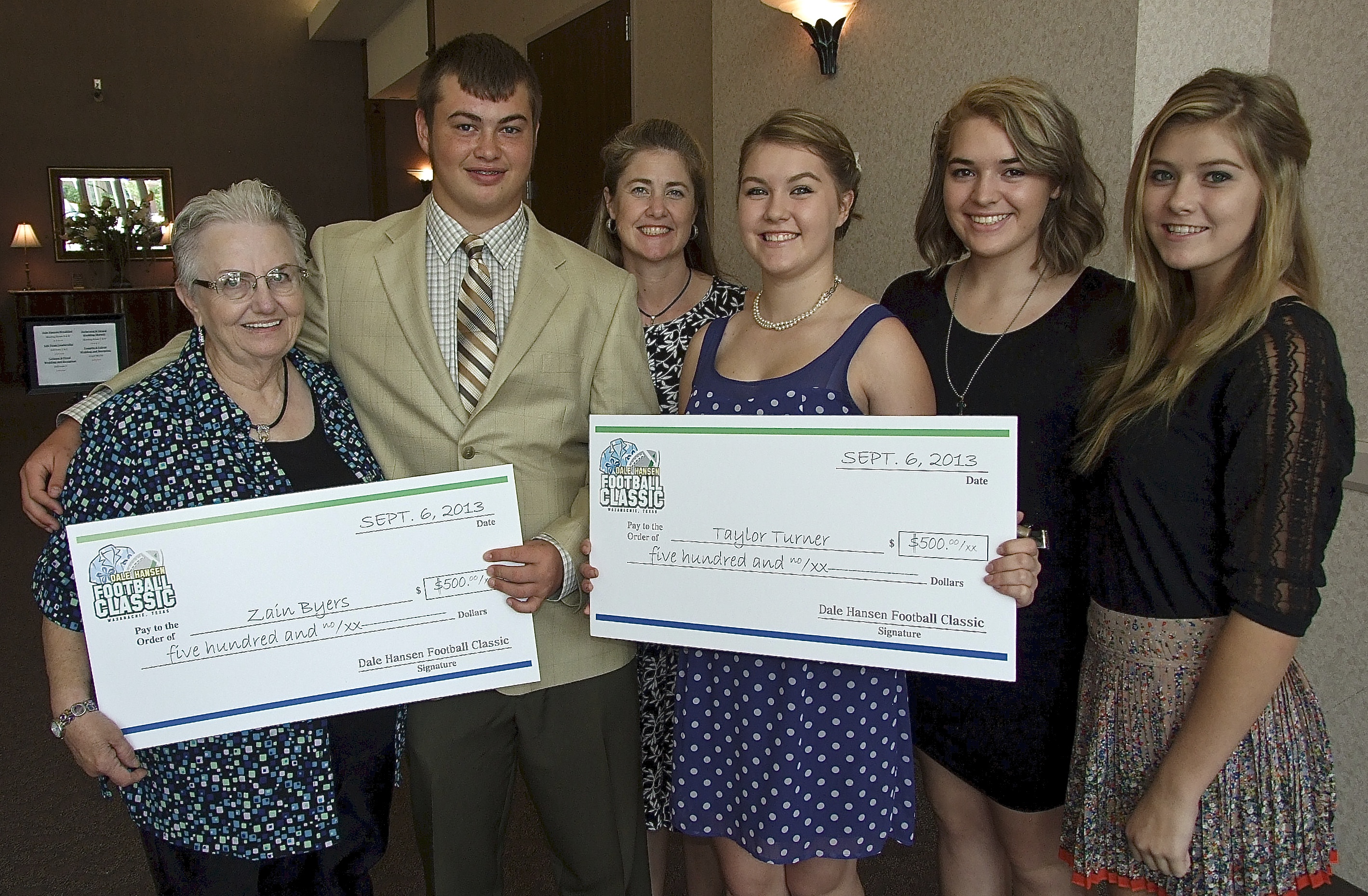Saturday morning following the game Ann Byers, Zain Byers, Ronda Cockerham, Taylor Turner, Quynci Wisdom and Halee Turner enjoy the Dale Hansen Football Classic’s Champions Breakfast held inside the Waxahachie Civic Center to honor Zain and Taylor who represented Italy High School as the 2013 scholarship winners with both seniors receiving checks for $500. Dale Hansen himself made the presentations and entertained guests with humor and a message, “High school only happens once in your life. There is no going back to do it over. Really enjoy the experience and cherish this special moment in your lives.” (Barry Byers)