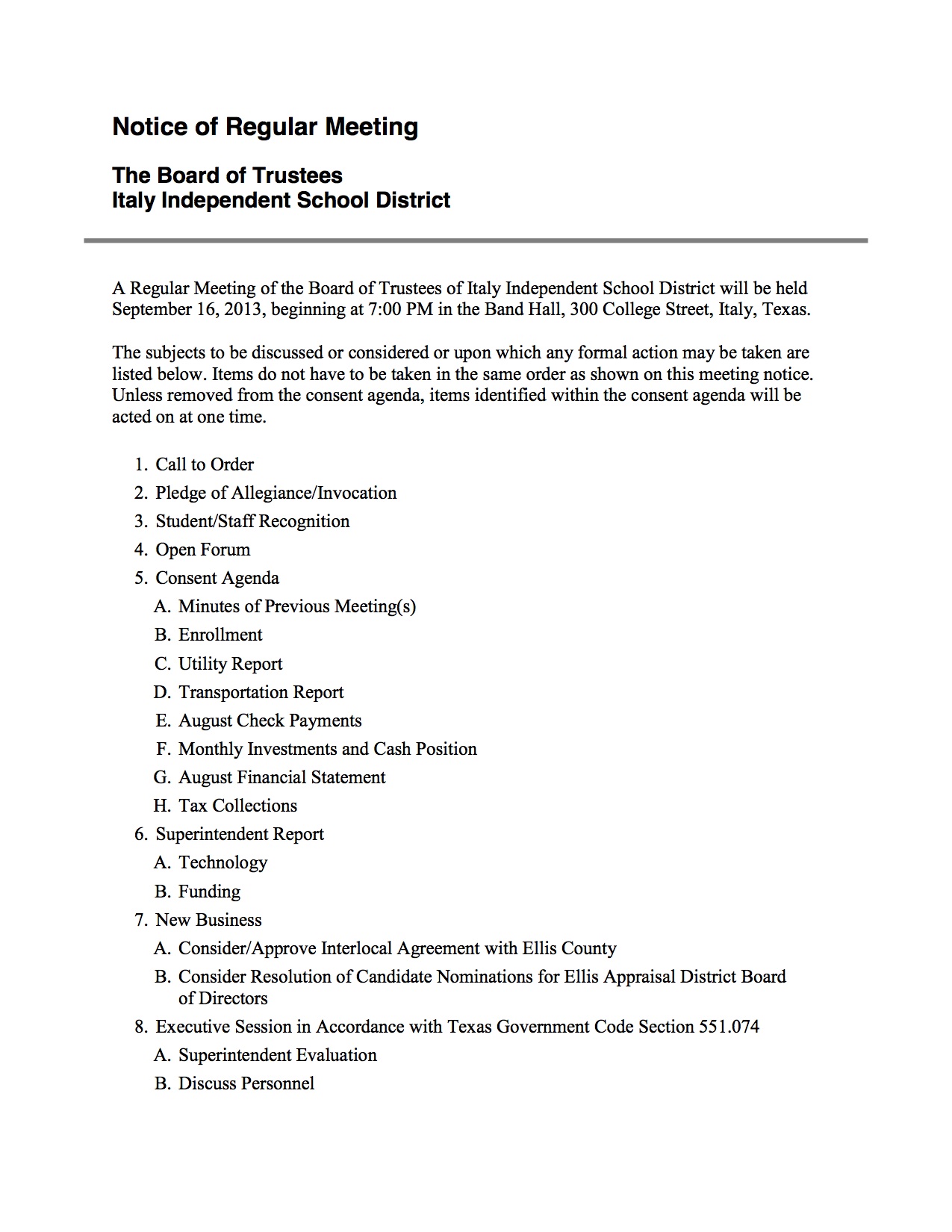 Agenda: Italy ISD School Board Meeting-Monday, September 16, 2013 « previous story album next » Agenda: page 1 (Italy ISD Administration Office) Download original photo