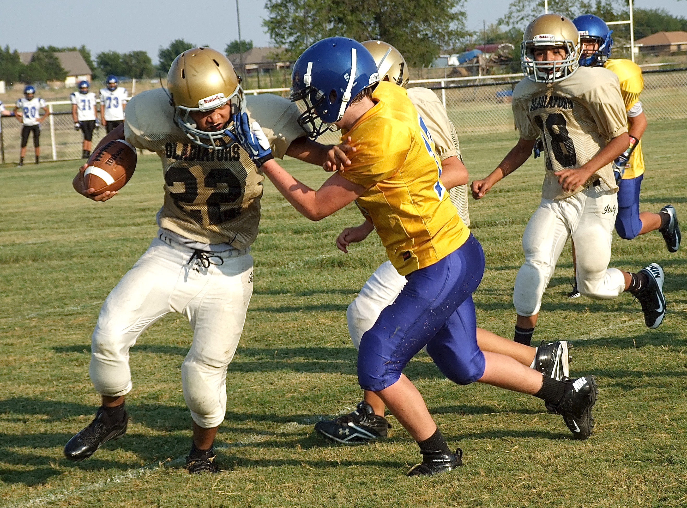 Italy’s JH/JV Gladiators leave it all out on Willis Field against Sunnyvale « previous story album next » Jonathan Salas(22) face thru an illegal face mask and keeps on running. (Barry Byers) Download original photo