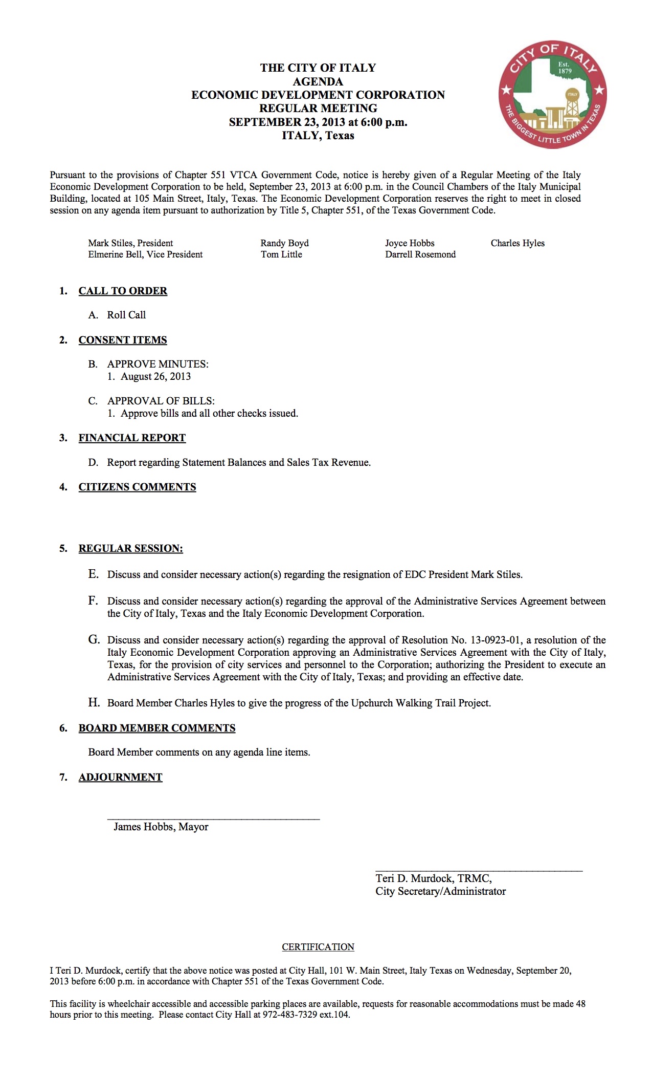 Agenda: Italy EDC Meeting-Monday, September 23, 2013 « previous story album next » Agenda (http://www.ci.italy.tx.us) Download original photo