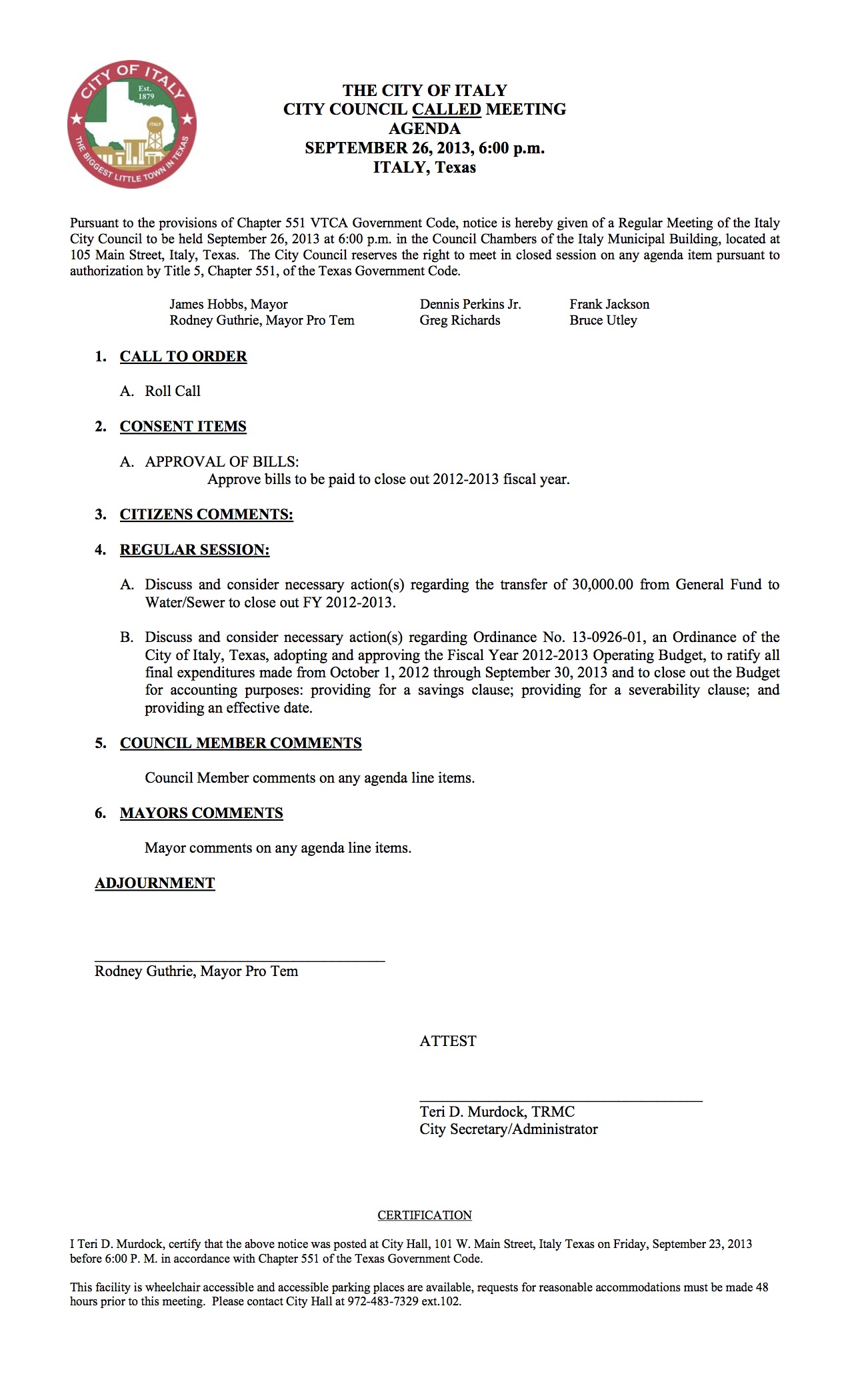 Agenda: Italy City Council Called Meeting-Thursday, September 26, 2013 « previous story album next » Agenda (http://www.ci.italy.tx.us) Download original photo