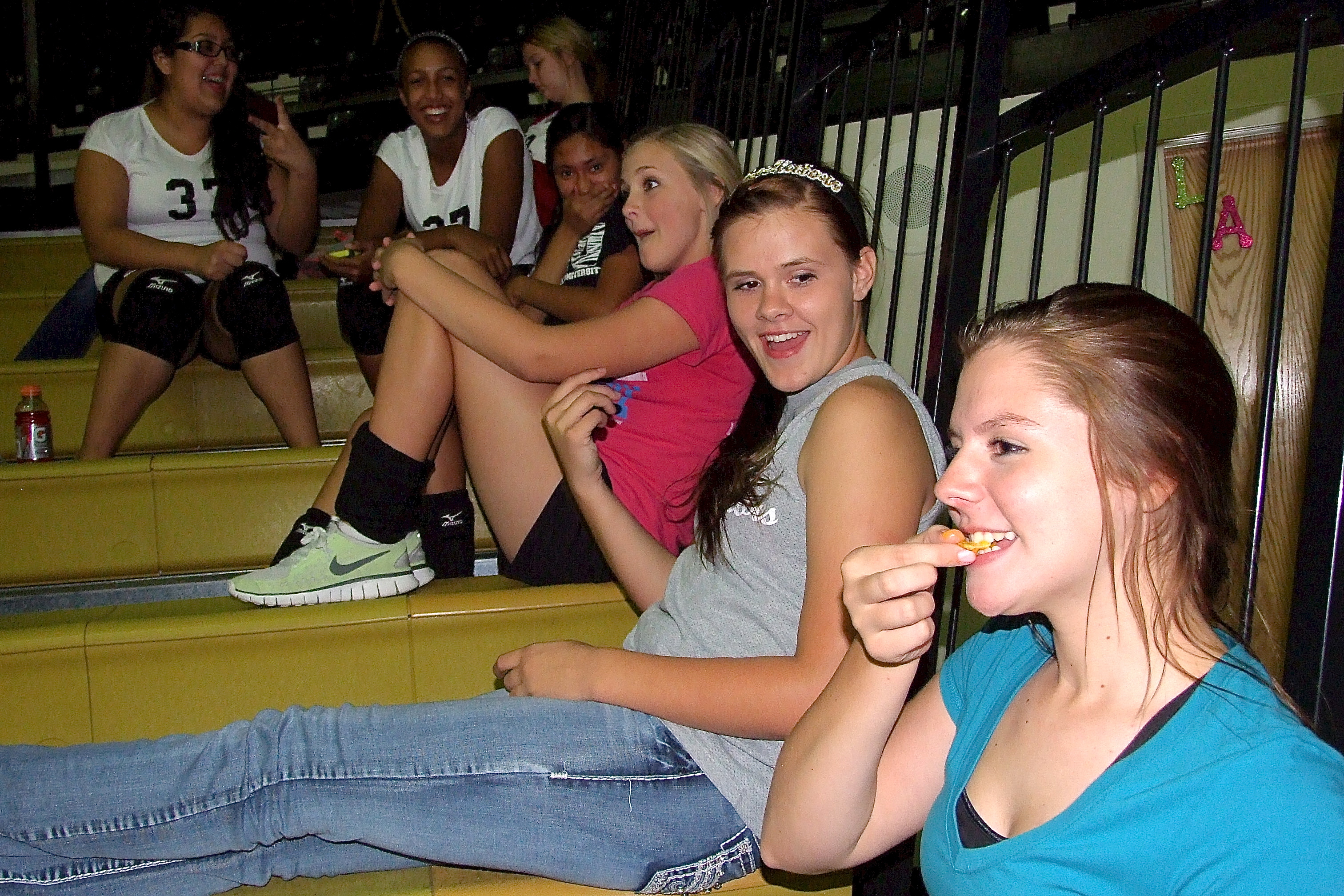 Brooke DeBorde (on nacho), Lillie Perry, Annie Perry, Marlen Hernandez, Emmy Cunningham, Lorena Rodriguez and Rachel Huskins have a little funny while watching the game. (Barry Byers)