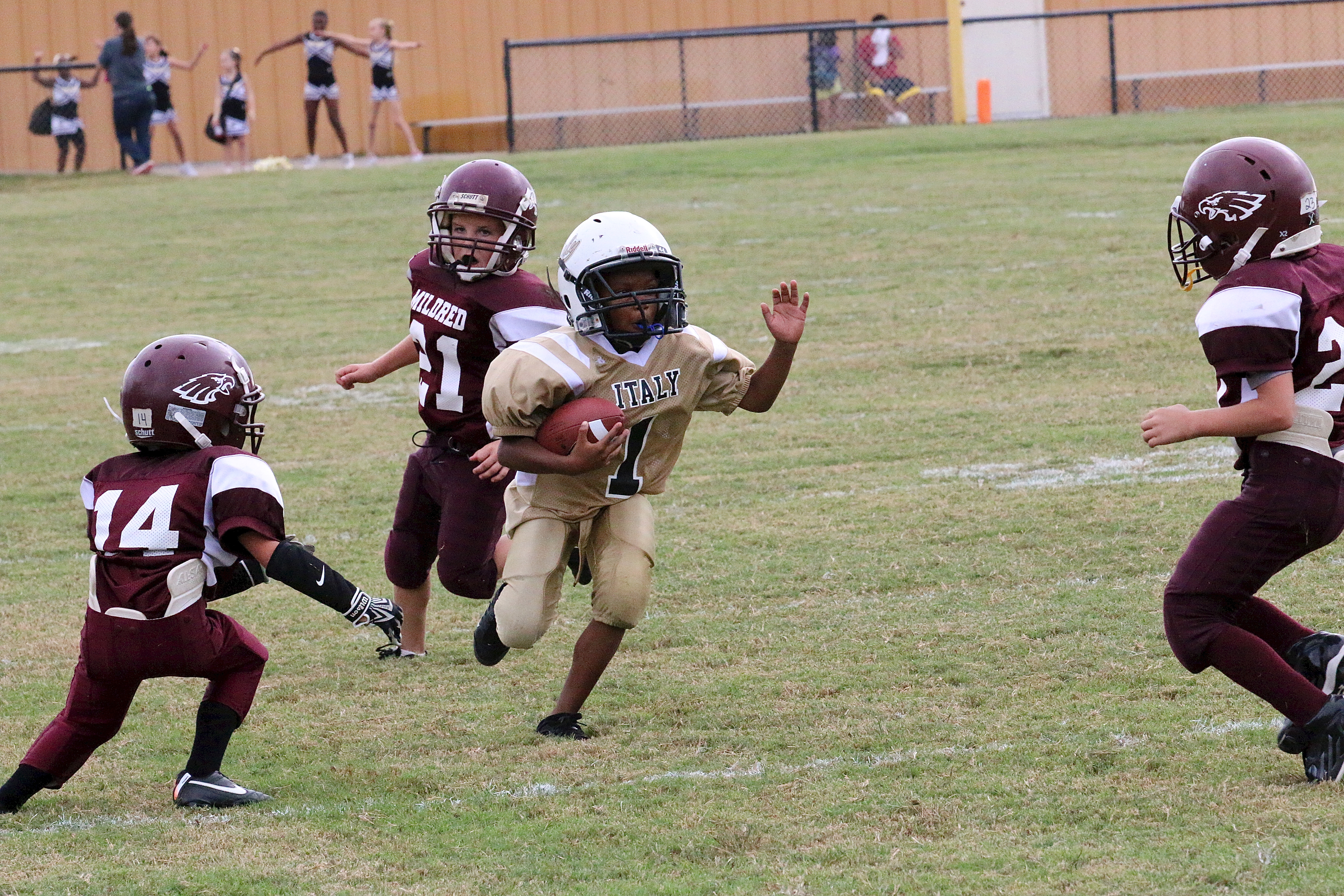 2013 IYAA football and cheerleading versus the Mildred Eagles « previous story album next » Curtis Benson(1) avoids Eagle defenders. (Barry Byers) Download original photo
