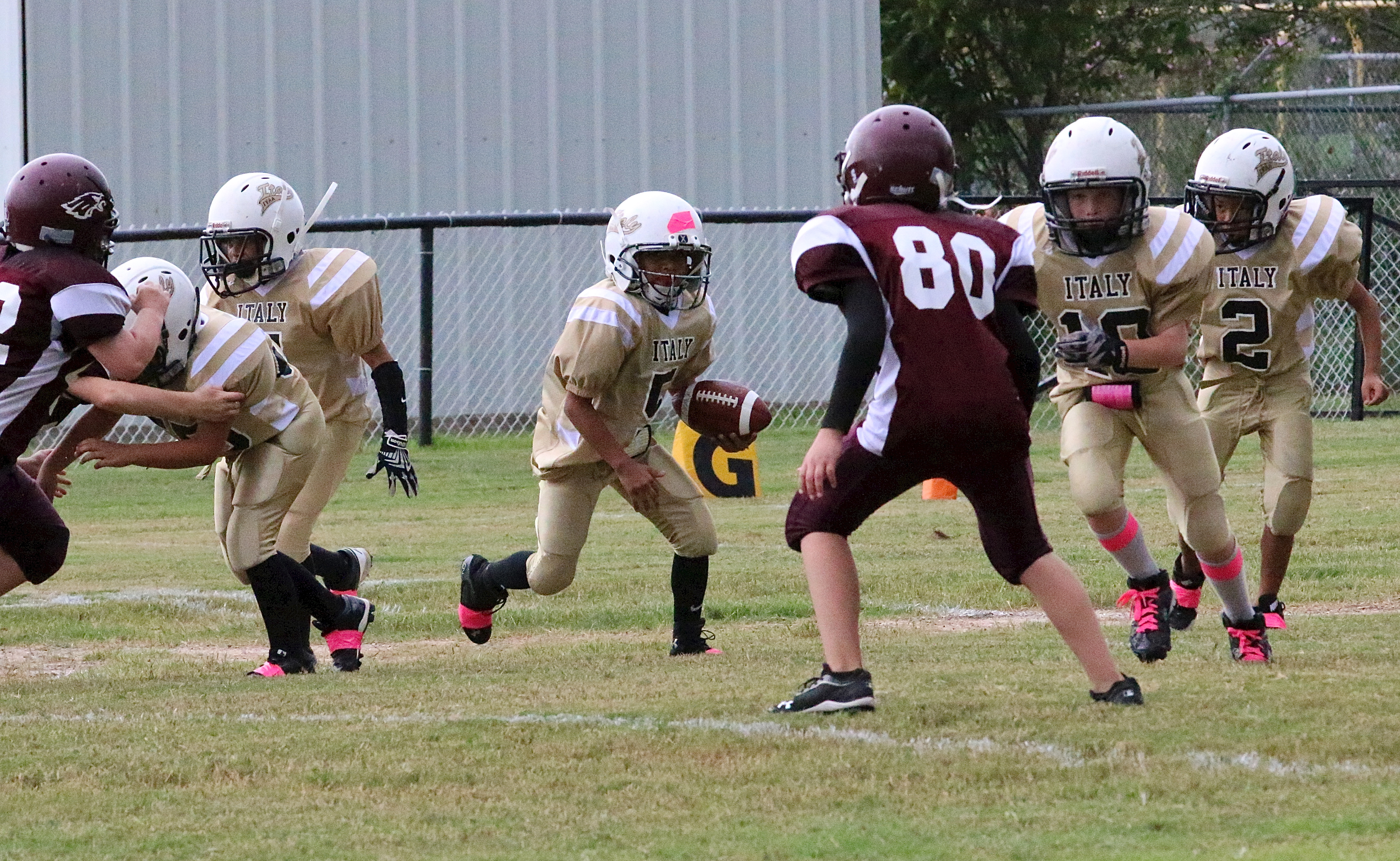 2013 IYAA football and cheerleading versus the Mildred Eagles « previous story album next » B-team quarterback Jeremy Munoz(5) gets a block from Gabe Martinez(55) and then falls in behind lead blockers Ty Cash(10) and Jalyn Wallace(2). (Barry Byers) Download original photo