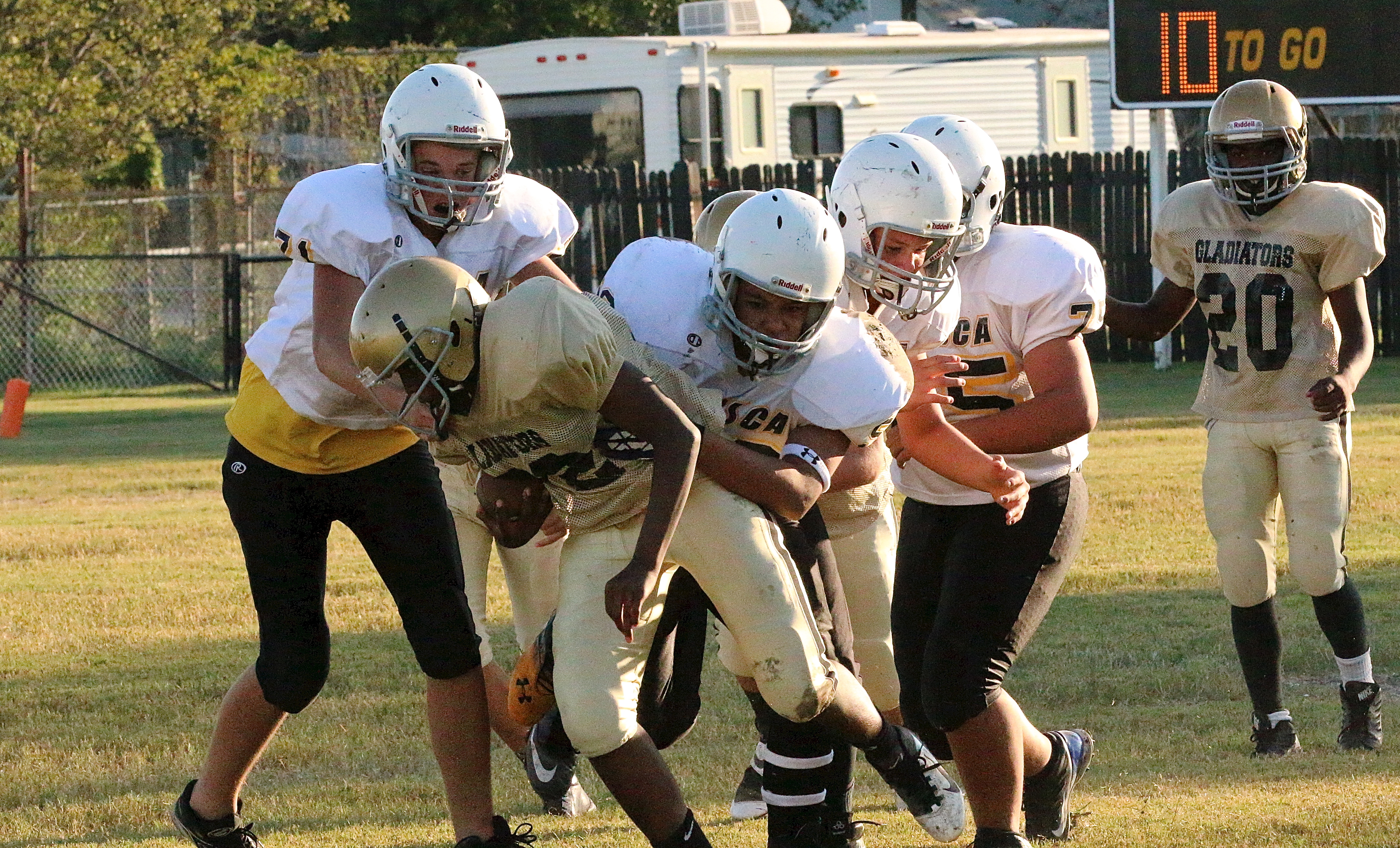 Italy’s Junior High and JV teams both win their district openers against Itasca « previous story album next » …Linebacker Anthony Lusk(72) intercepts the pass and then gets attacked by the Cats. (Barry Byers) Download original photo